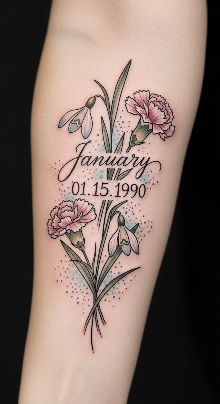 Each choice reflects your story, infusing your tattoo with energy and meaning, making it not just art but a symbol of your journey. This design symbolizes new beginnings and remembrance—snowdrops for hope and carnations for affection—while the scripted date anchors a specific life moment; emotionally it feels intimate and contemplative, suited to the inner forearm where it can be viewed easily yet remain private, sized to allow fine detail without overwhelming the arm.