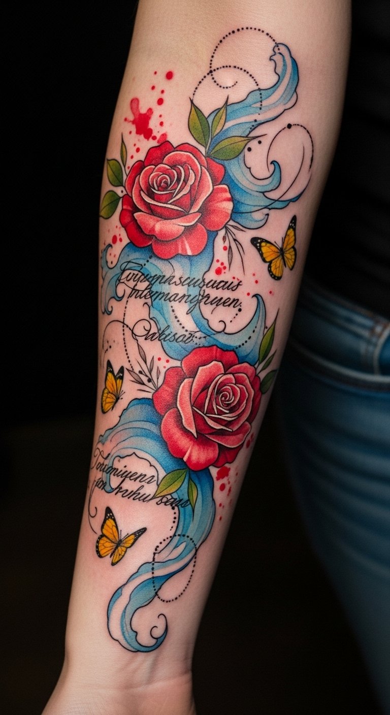 This design uses red roses for passion and resilience, blue wave motifs for inner calm and emotional flow, and yellow butterflies for optimism and transformation; the fine-line script can hold a short personal phrase, placed along the inner forearm for visibility and intimacy, evoking warmth, empowerment, and continuity as movement follows the arm.