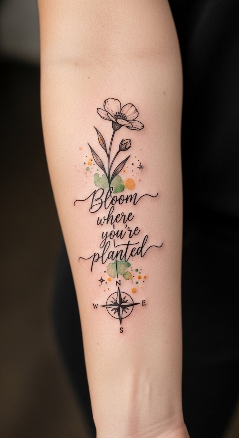 This design ties the quote directly to natural growth (wildflower) and inner direction (compass), the watercolor hints adding warmth and motion to symbolize emotional transitions. The fine-line style keeps it intimate and timeless; place it along the inner forearm or ribcage for a personal, frequently visible reminder that balances fragility and strength.