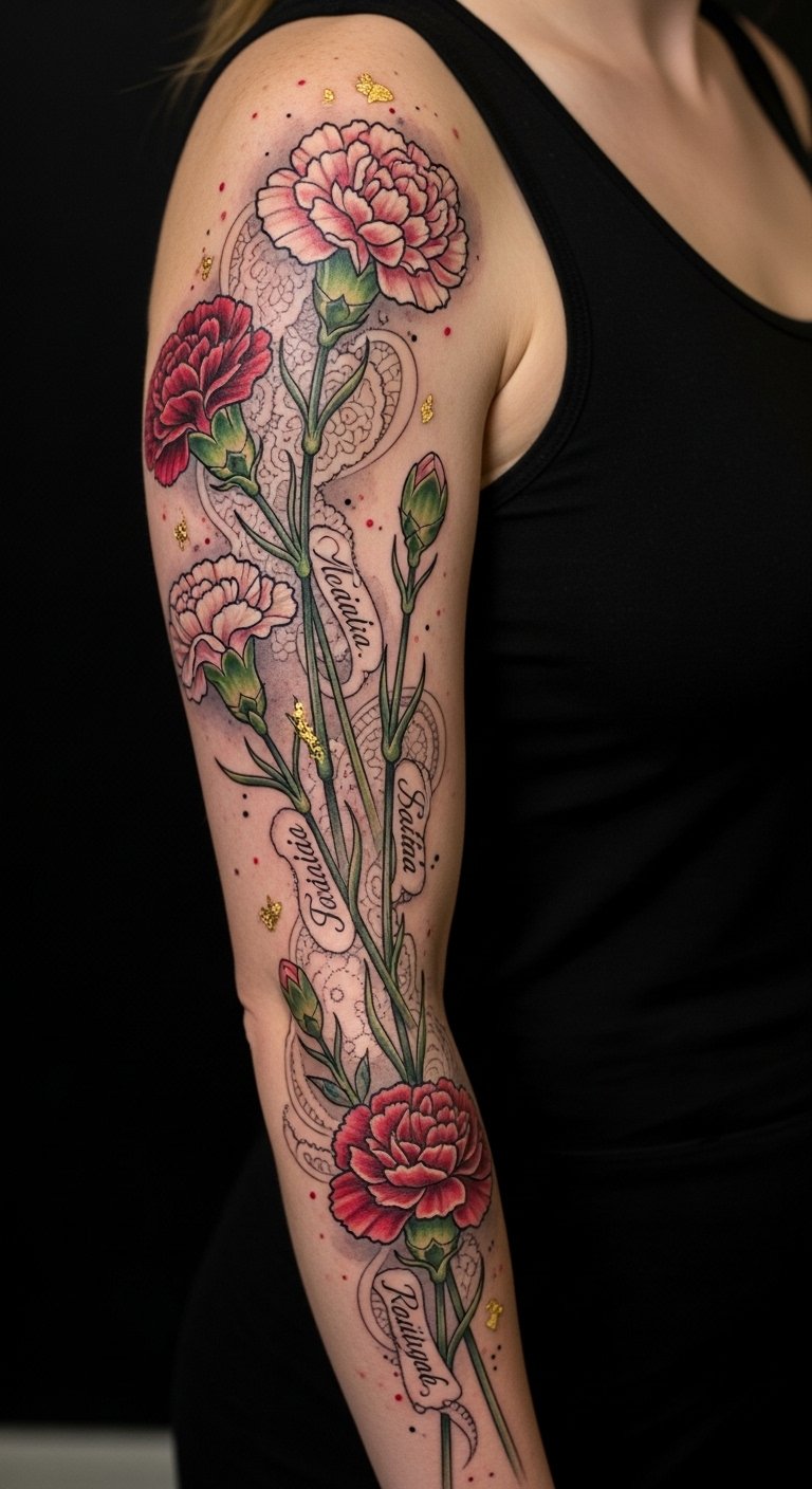 Each inked petal signifies a bond, allowing you to carry their spirit with you always. Place along the forearm or wrap around the upper arm for visibility and intimacy; the carnations symbolize enduring love and remembrance, the varying bloom stages reflect the cycle of life, and the intertwined names and lace evoke personal stories and delicate emotional ties.