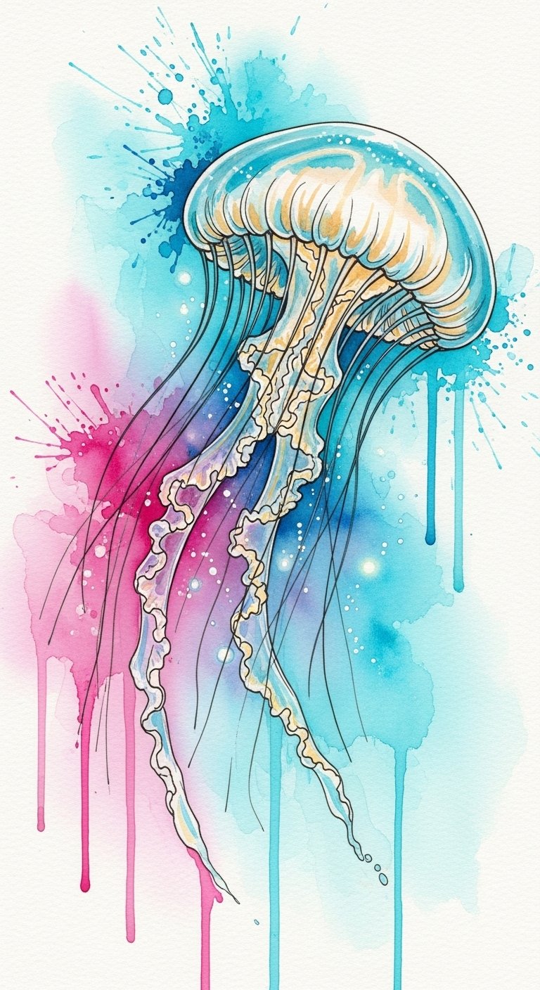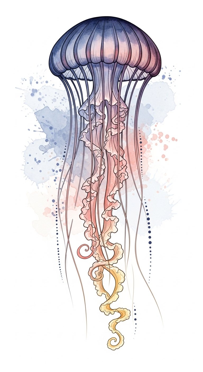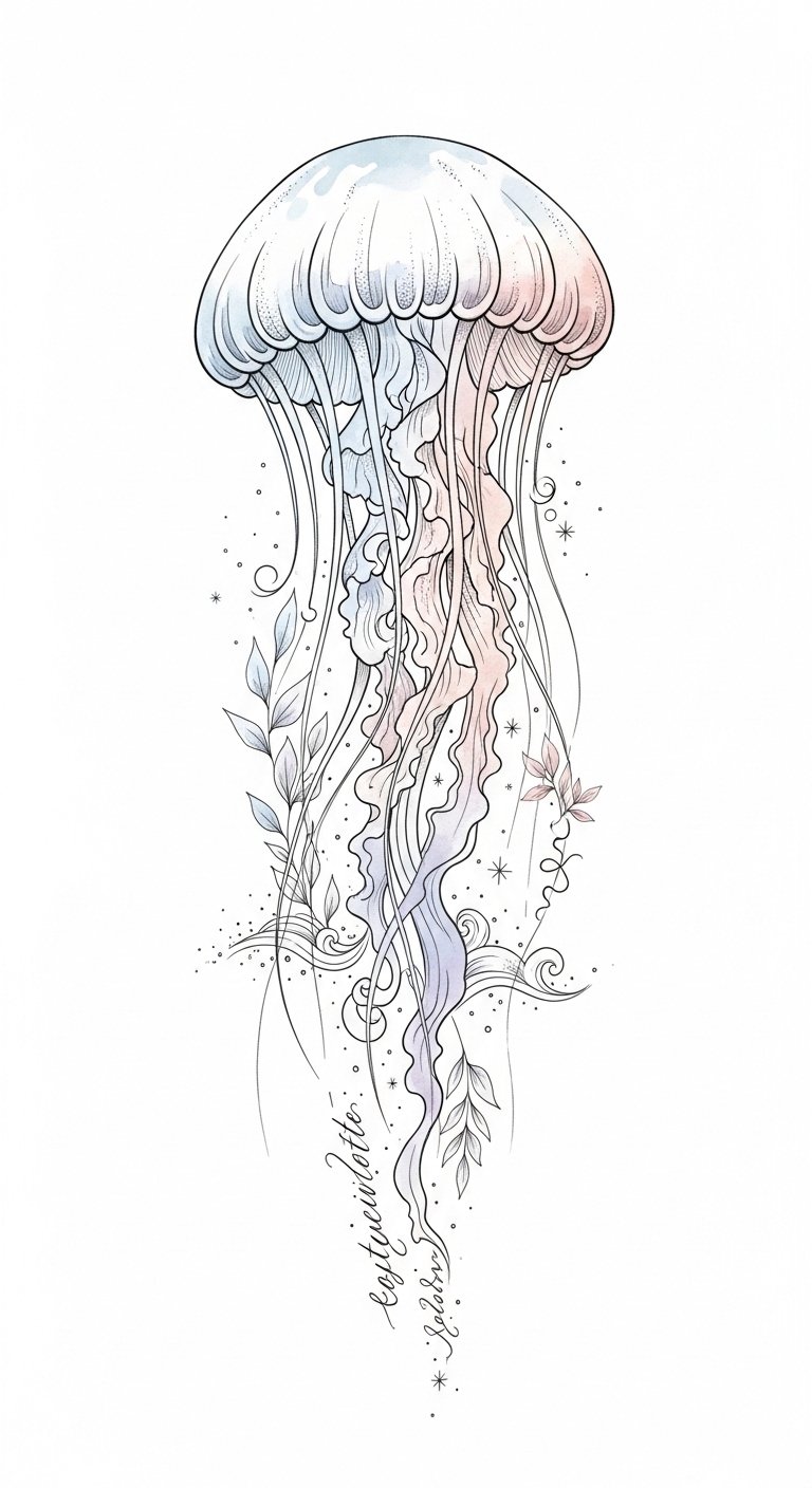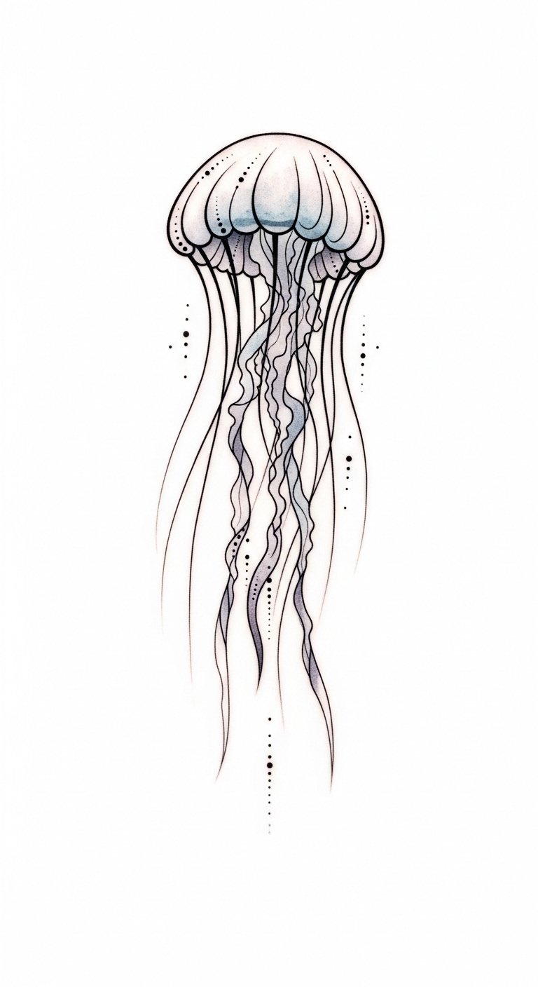This tiny jellyfish symbolizes quiet resilience, effortless movement, and a gentle connection to inner freedom; its minimalist lines convey calm confidence and adaptability while the soft watercolor wash evokes emotional depth and serenity.