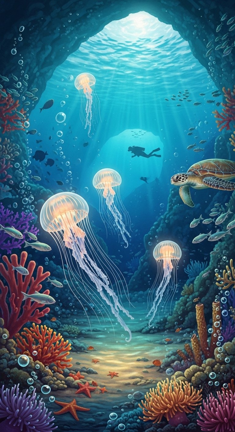 This design pairs lifelike jellyfish rendered with translucent gradients and fine-line tentacles against a backdrop of subtle coral, kelp, and small fishes, evoking calm and movement.