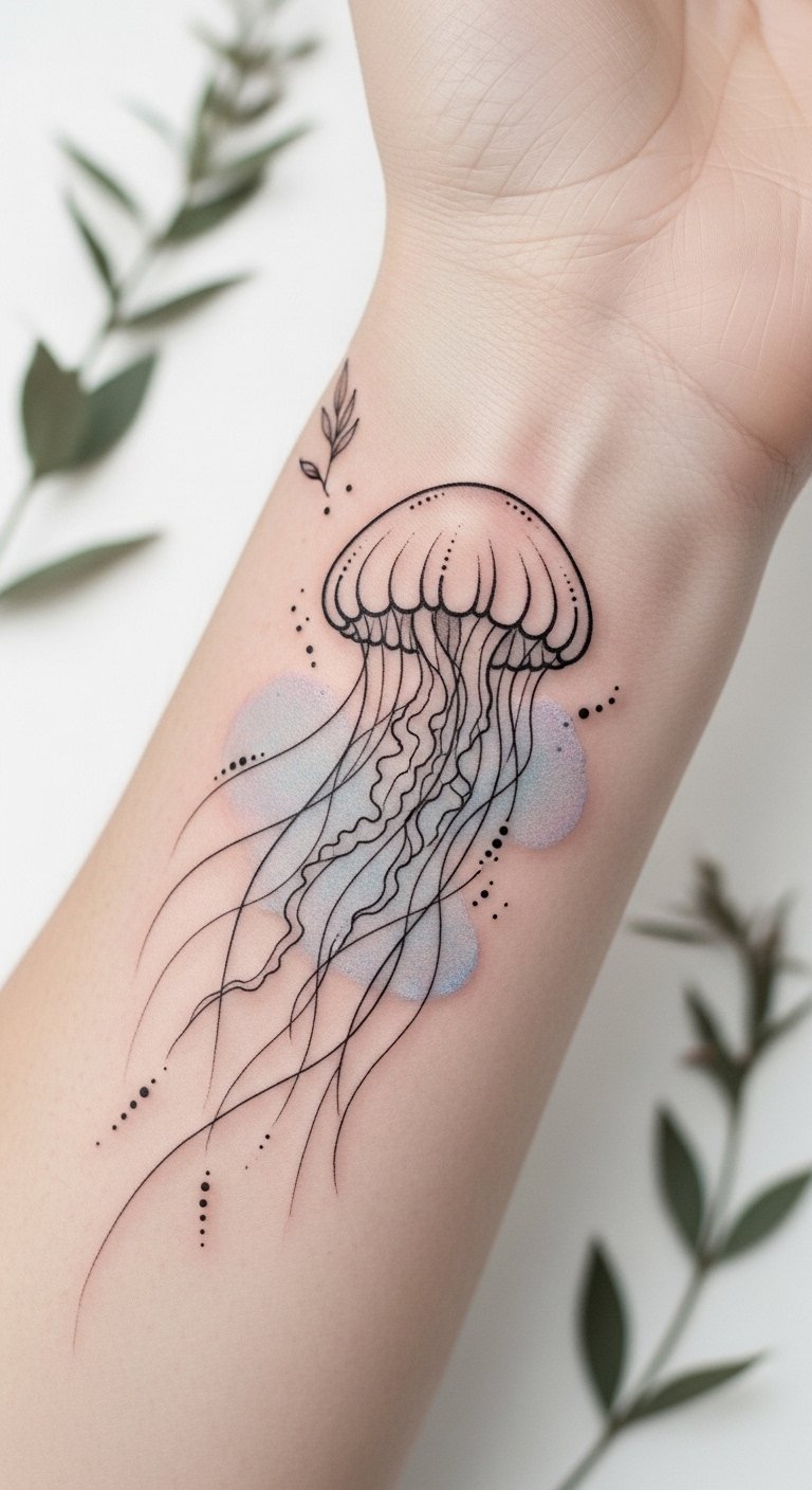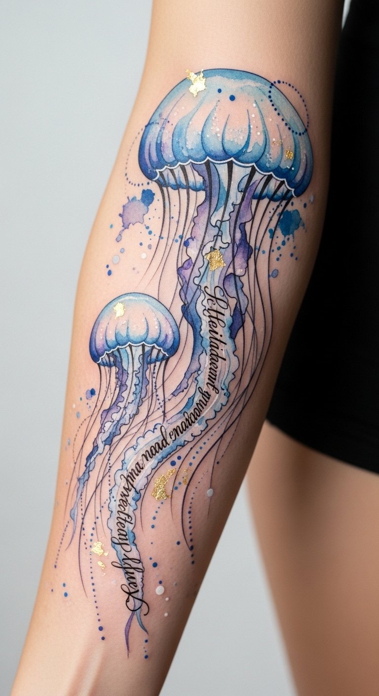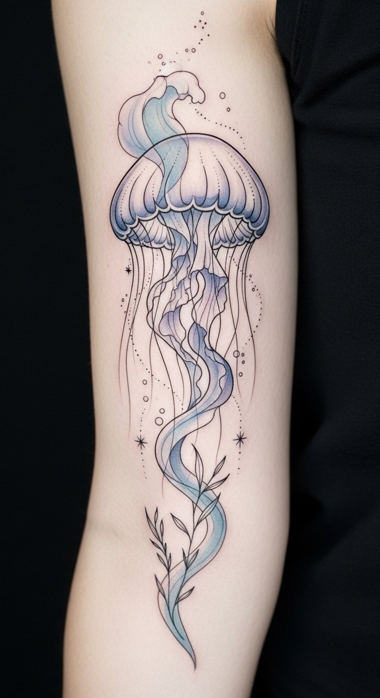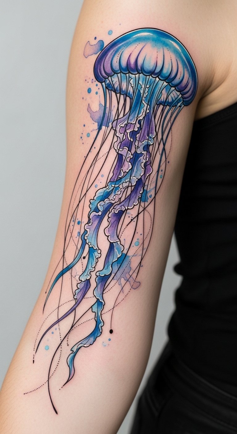This placement—forearm wrap for visibility and movement or shoulder blade for a more intimate canvas—enhances the symbolism: flowing tentacles align with muscle movement to convey adaptability, while the glowing bell and watercolor hues evoke freedom and emotional depth.