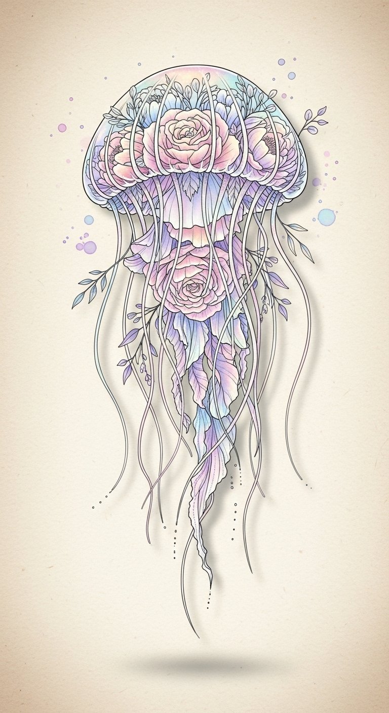 This fusion creates a stunning representation of jellyfish symbolism—freedom and adaptability—while embracing floral harmony. The delicate petals and flowing tentacles dance together, capturing your spirit’s essence.