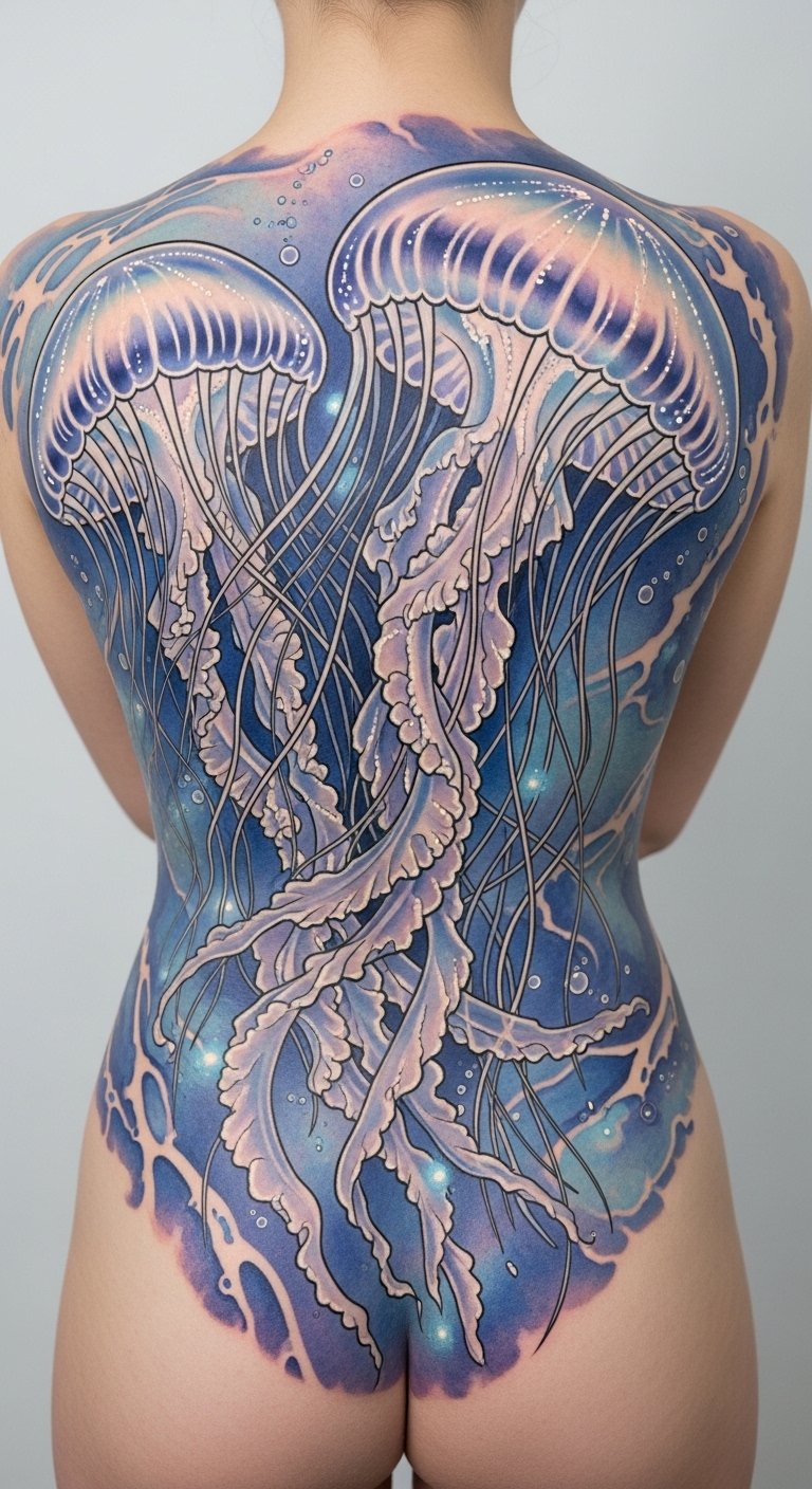 A large-scale jellyfish back tattoo can transform your entire canvas into a breathtaking ocean scene, enchanting eyes and igniting conversations.