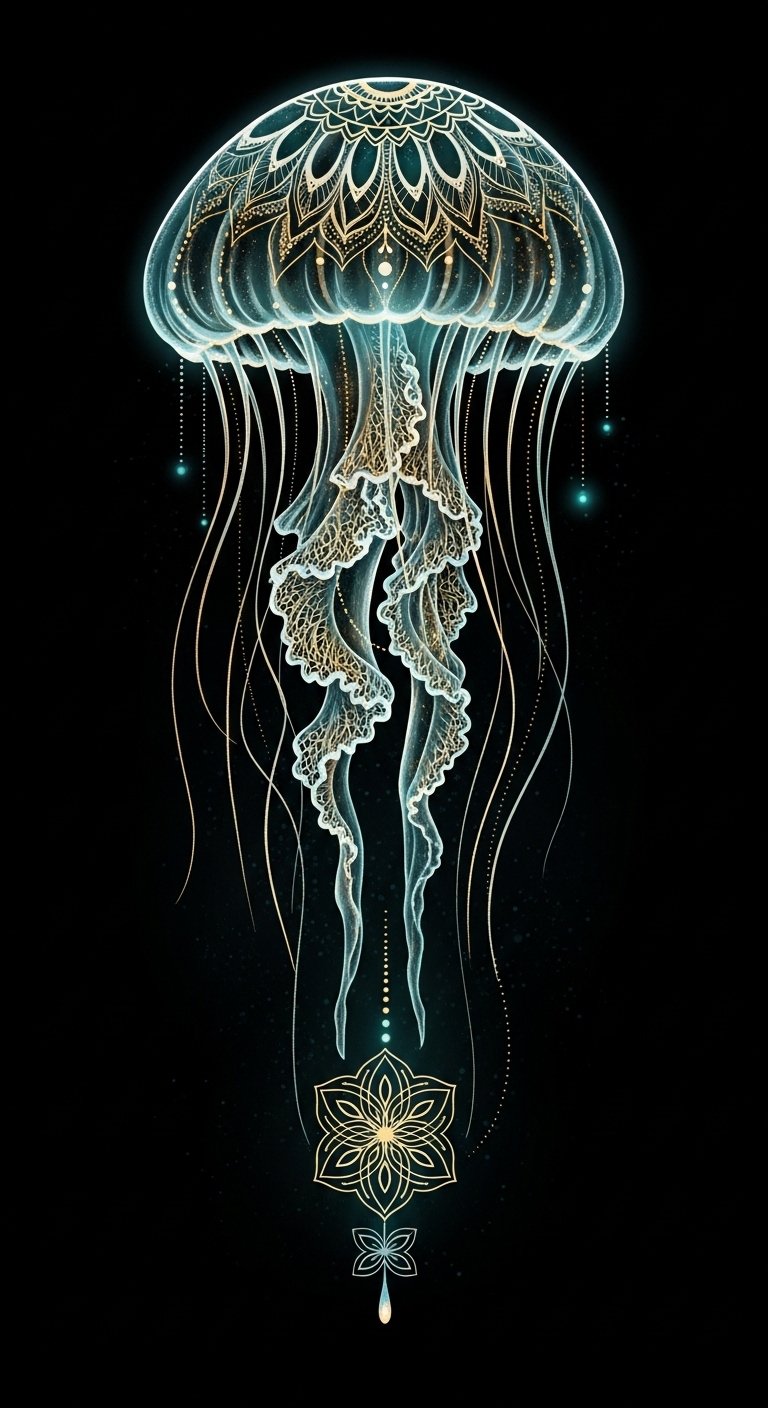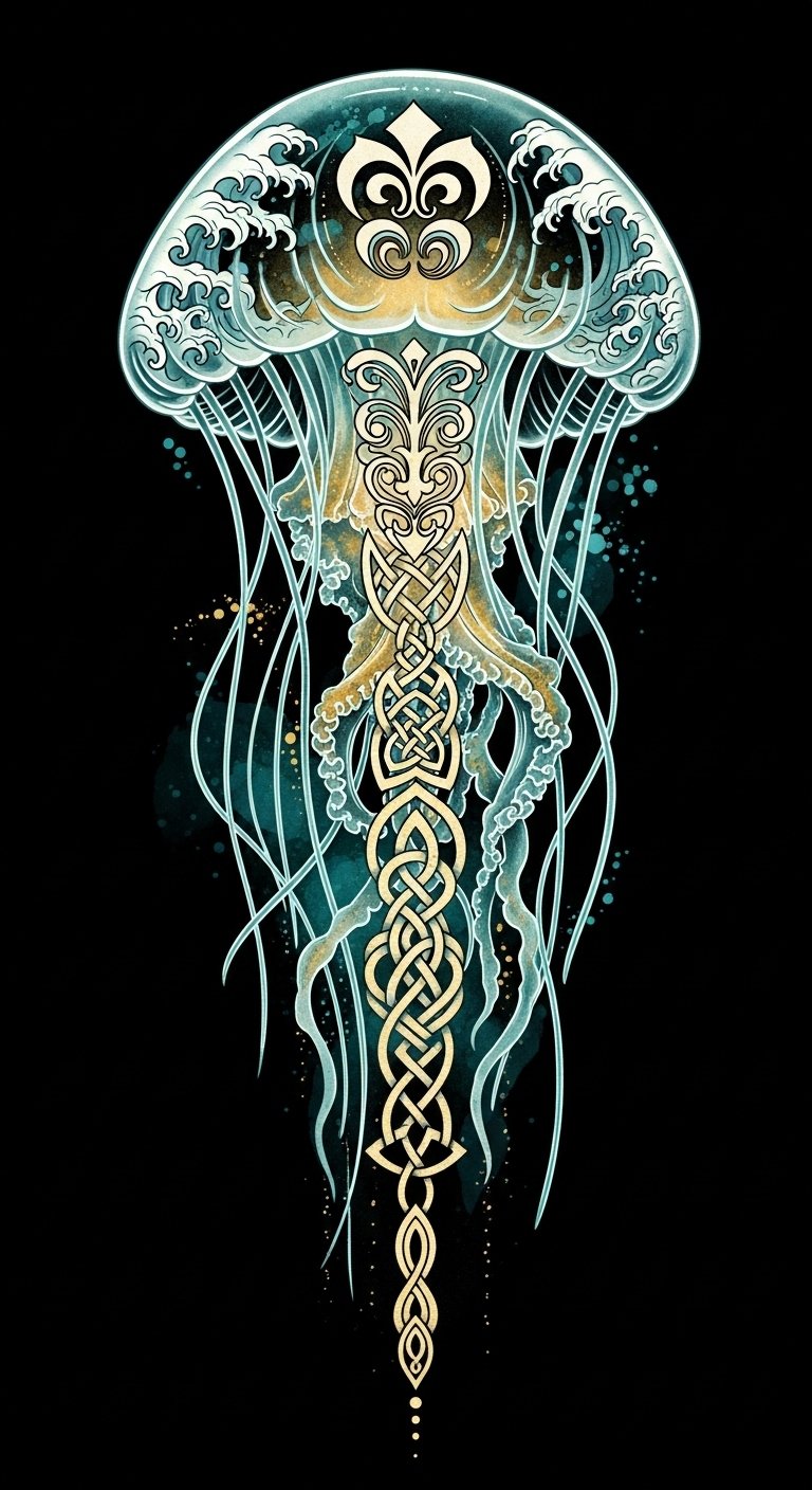 Infusing jellyfish mythology with vibrant cultural symbolism, these designs celebrate freedom, adaptability, and the ethereal nature of existence.
