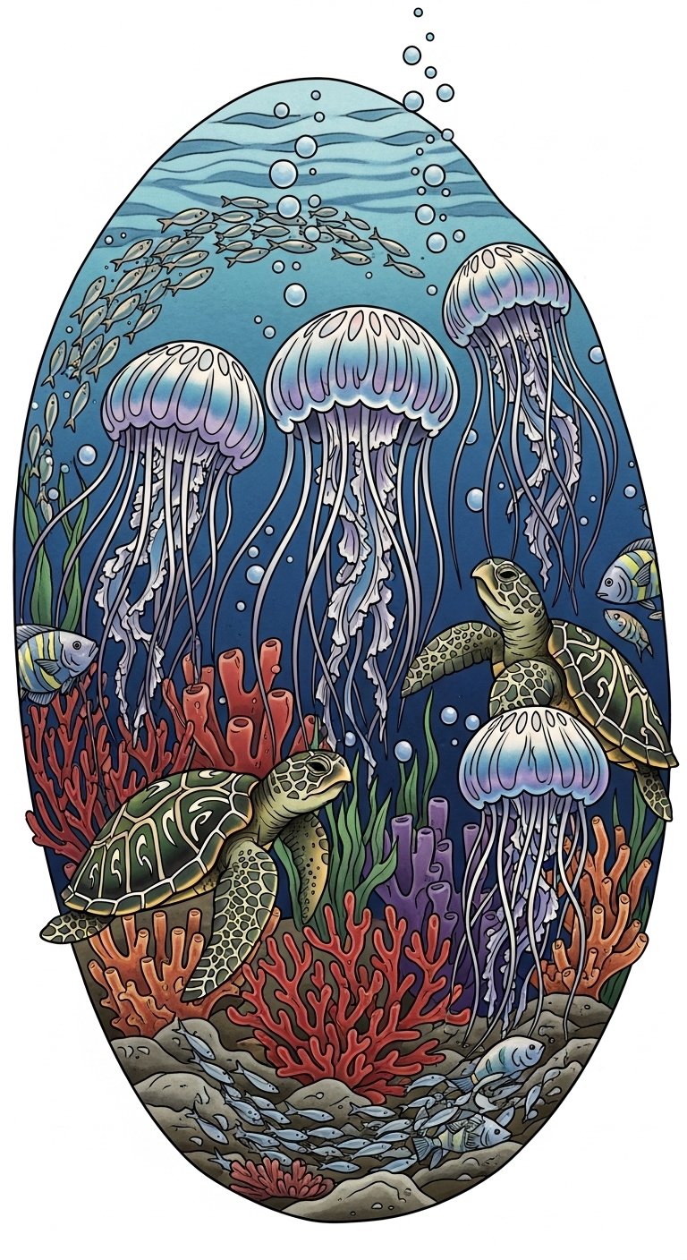 Symbolically this design speaks to freedom, resilience, and interconnectedness—jellyfish for adaptability and ethereal grace, coral and fish for ecosystem diversity, and the turtle for longevity and guidance—evoking calm introspection and respect for the ocean.