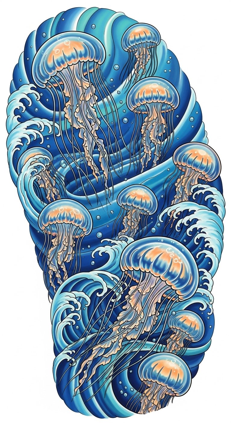 This design blends symbolism of resilience and adaptability (jellyfish) with calm, renewing forces (ocean waves), evoking a sense of peaceful motion and personal transformation; place along the forearm or ribcage to follow natural contours for fluid movement, or across the shoulder and upper back for a larger, flowing composition that reads from multiple angles while allowing colors and linework to emphasize graceful, drifting motion.