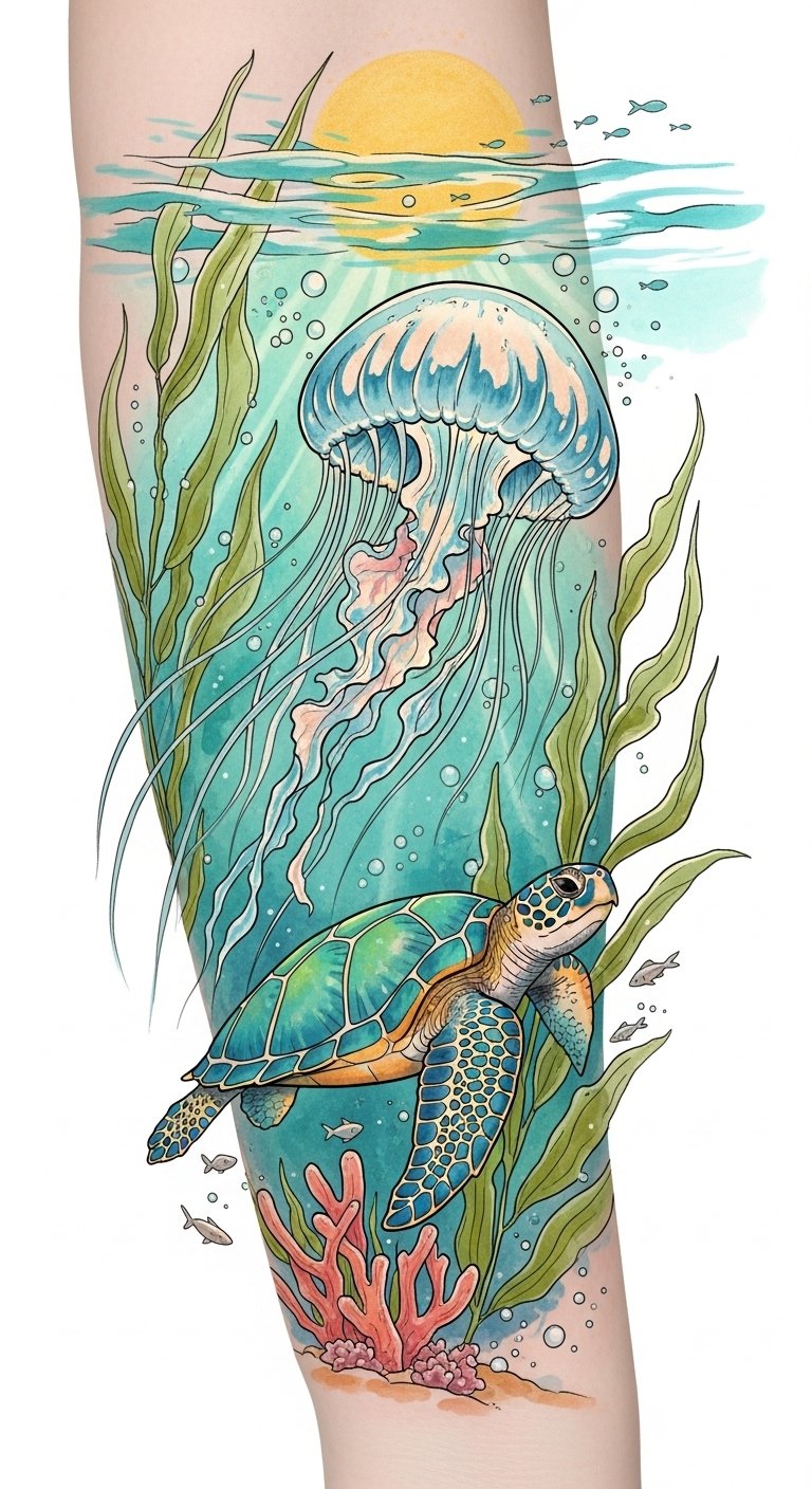 A flowing half-sleeve or back piece where luminous jellyfish float among intricate coral gardens, a serene sea turtle gliding through trailing tentacles, and darting schools of fish forming dynamic patterns; soft luminescent colors and fine-line details convey movement and depth.