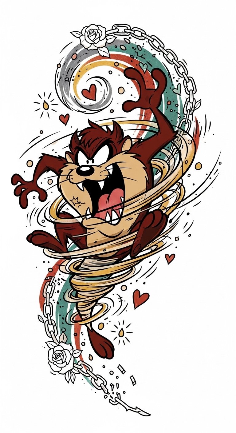 His wild antics reflect the unpredictable nature of love, reminding you that sometimes, embracing the madness leads to the most liberating experiences. The design places Taz at the core of the spiral to convey a personal center amid chaos; hearts and sparks suggest fleeting passions, roses along the outer swirl symbolize the beauty that grows from tumult, and broken chains hint at release and liberation.