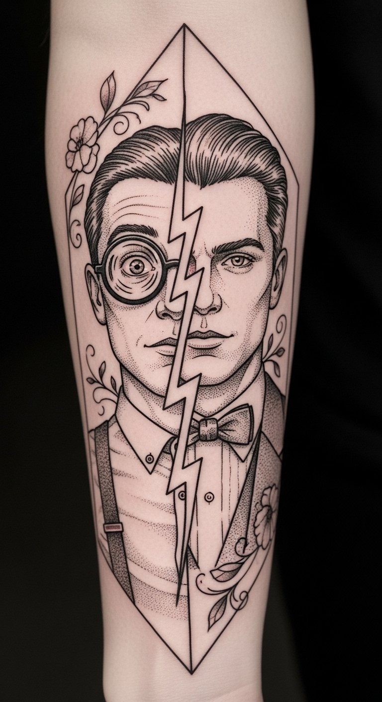 This tattoo channels that interplay of awkwardness and charm: the lightning bolt signifies sudden transformation, the floral filigree represents growth and softness overlaying rigid personas, and the contrasting color accents highlight individual traits.