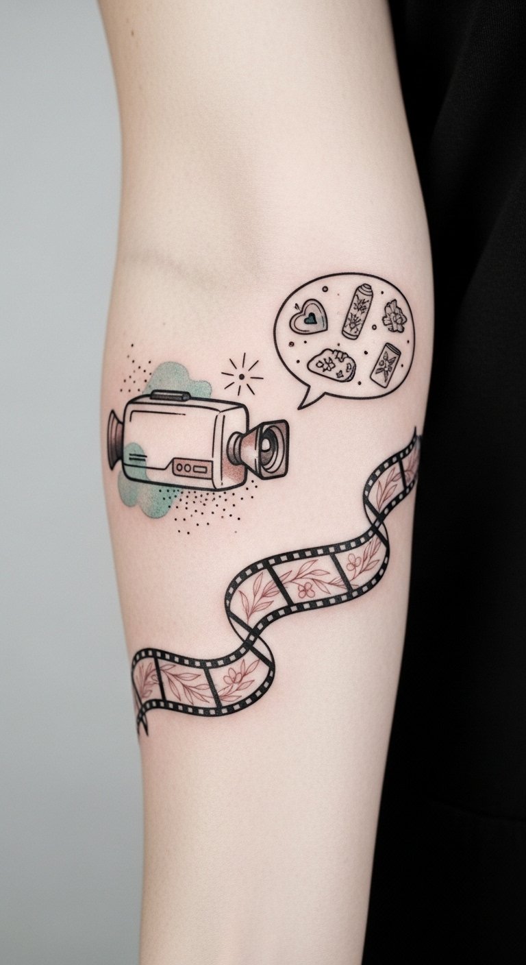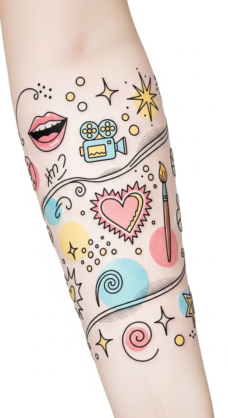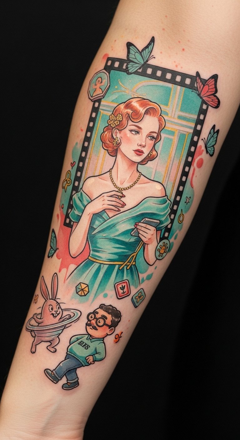 Emotionally, the piece feels nostalgic yet optimistic, playful with introspective undertones. Ideal placement is a forearm sleeve that wraps so each element reveals itself with movement, allowing the viewer to trace the story from wrist (butterflies emerging) up toward the elbow (cartoon figures and Kristen Bell’s skit focal point).