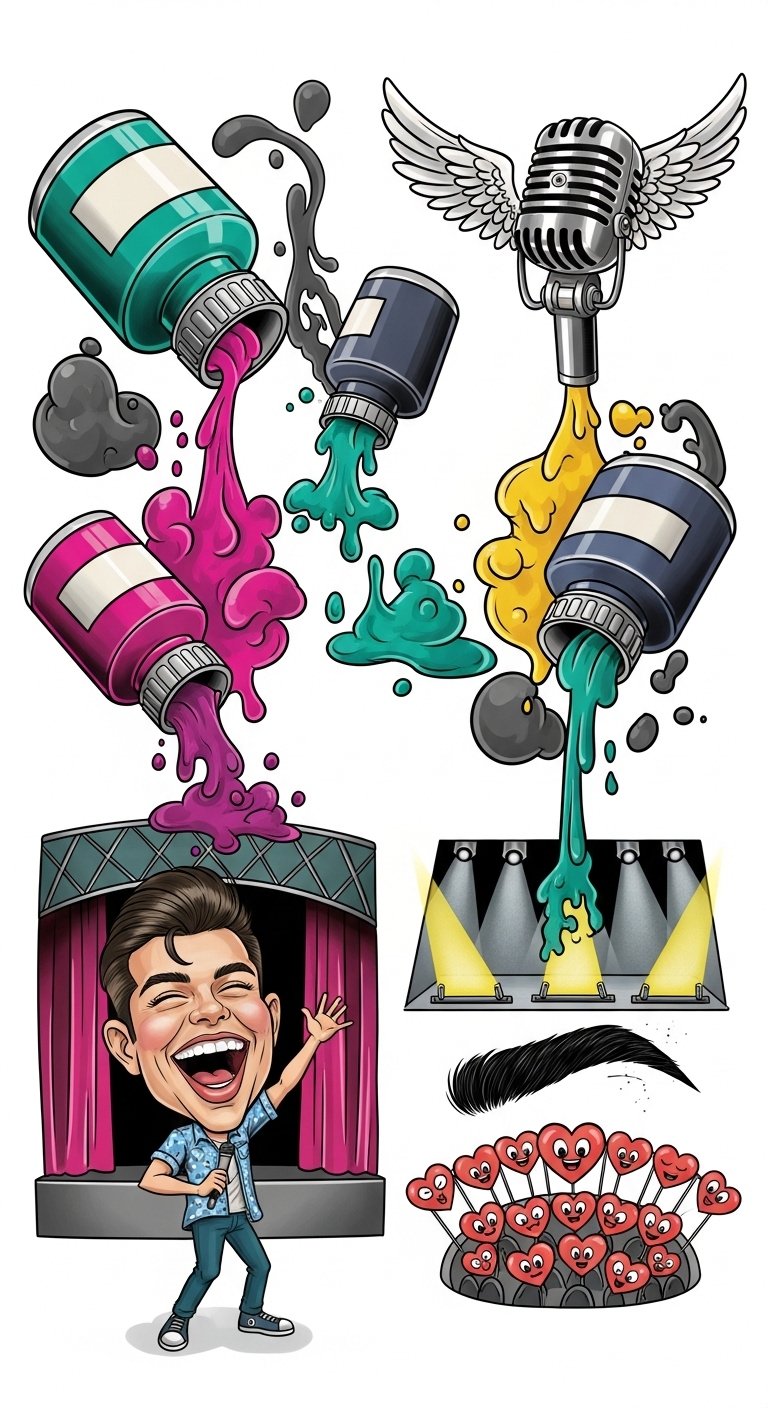 The tattoo concept captures the humor and theatricality of the skit: exaggerated motifs and caricature elements symbolize comedic timing and self-expression, while spilled ink and motion lines convey spontaneity and creative chaos.
