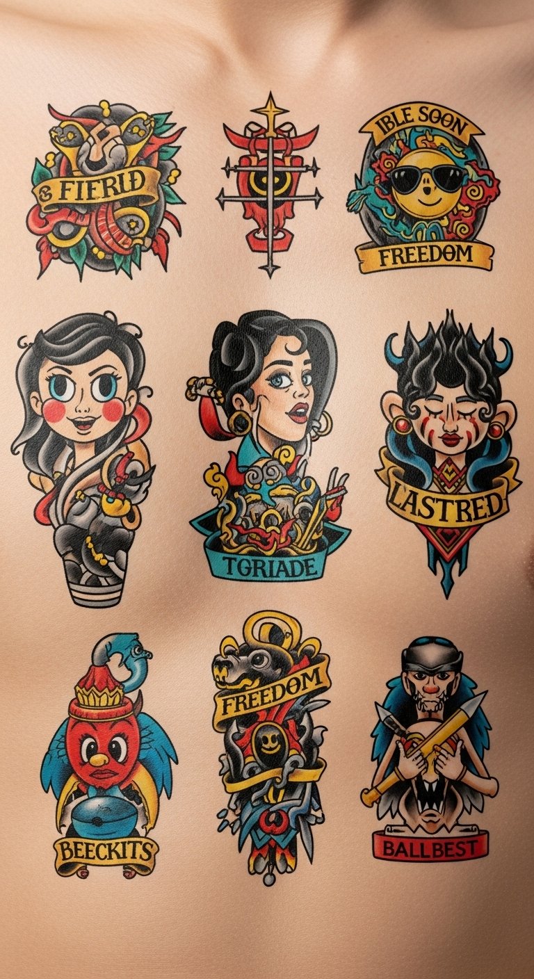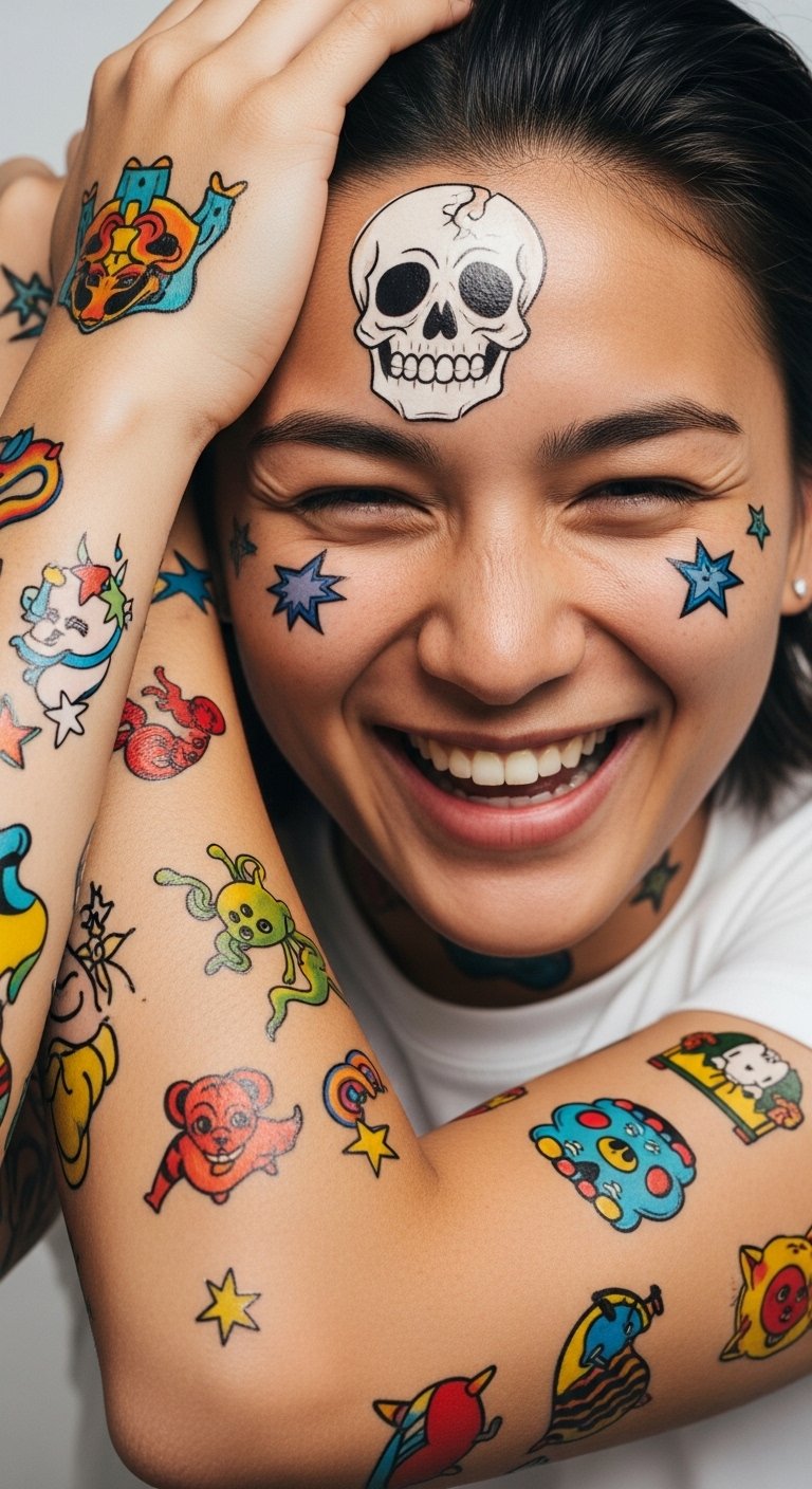 Body art isn’t just about permanent ink; it’s also a canvas for creative expression through illusions that captivate and entertain. You can explore vibrant tattoo symbolism that tells stories and evokes emotions. Each illusion, from whimsical cartoons to rich cultural references, reflects your artistic expression. Embrace this journey, where temporary designs ignite passion and inspire a celebration of freedom in self-identity. This design concept blends vivid, whimsical cartoon elements with culturally inspired motifs to create an illusionary sleeve that seems to shift as the arm moves; bright colors and fine linework symbolize joy, memory, and individual storytelling, evoking playful confidence and nostalgia. Ideal placement is a full forearm sleeve wrapping onto the outer bicep so the illusions change perspective with motion, allowing the wearer to display different narrative panels depending on posture and interaction.