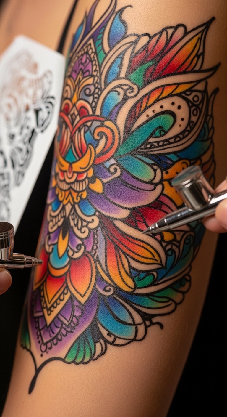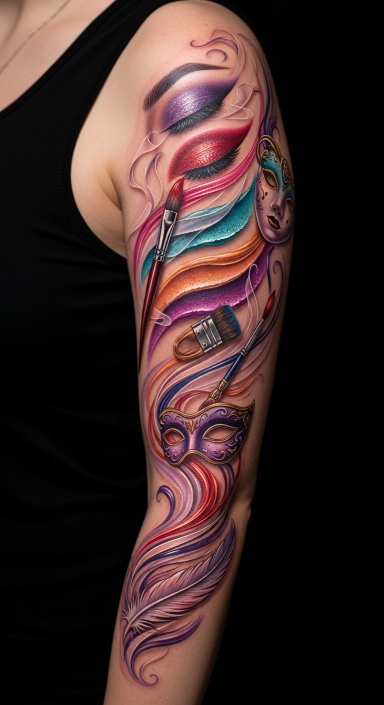 This design concept translates the original text’s celebration of temporary, expressive body art into a visual motif: a flowing, multicolored sleeve that appears layered and dimensional like airbrushed makeup—feathered gradients, finely stenciled filigree, and faux-ink shading that suggests depth without permanence. Symbolically it represents transformation, self-expression, and the freedom to experiment; emotionally it conveys playfulness, boldness, and renewal. Ideal placement is along the forearm or shoulder where movement enhances the illusion and the layered colors can be viewed from multiple angles.