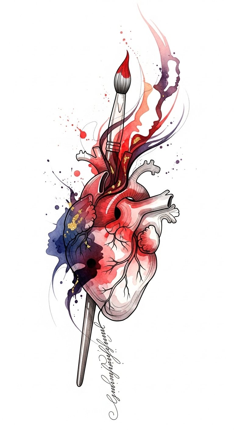 The design symbolizes emotional expression as an active, living force—an anatomical heart becoming tools of art suggests that feeling and creating are inseparable. Translucent brushstrokes and faces hidden in the splashes represent layered personal and collective narratives revealed through art, while the gold leaf accents celebrate the bravery of sharing one’s innermost self.