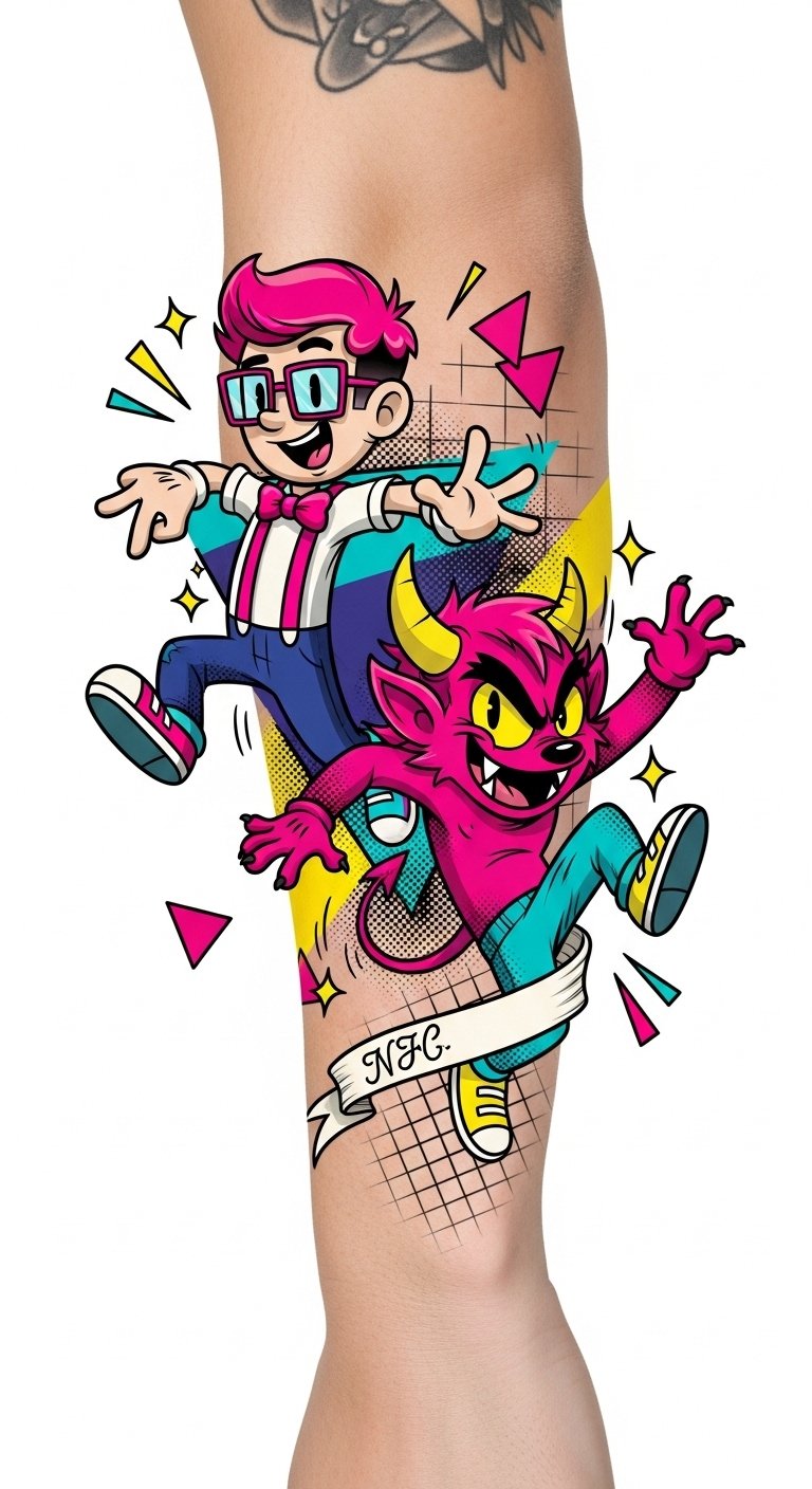 A compact forearm design that celebrates fluid, joyful identity: Taz and Steve Urkel act as playful alter-egos representing energy and nerdy charm, the banner and confetti signaling permission to embrace whimsy, and the dotted trail binds the elements to suggest ongoing self-discovery.