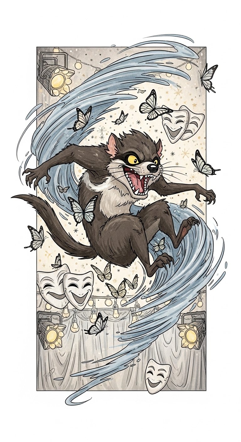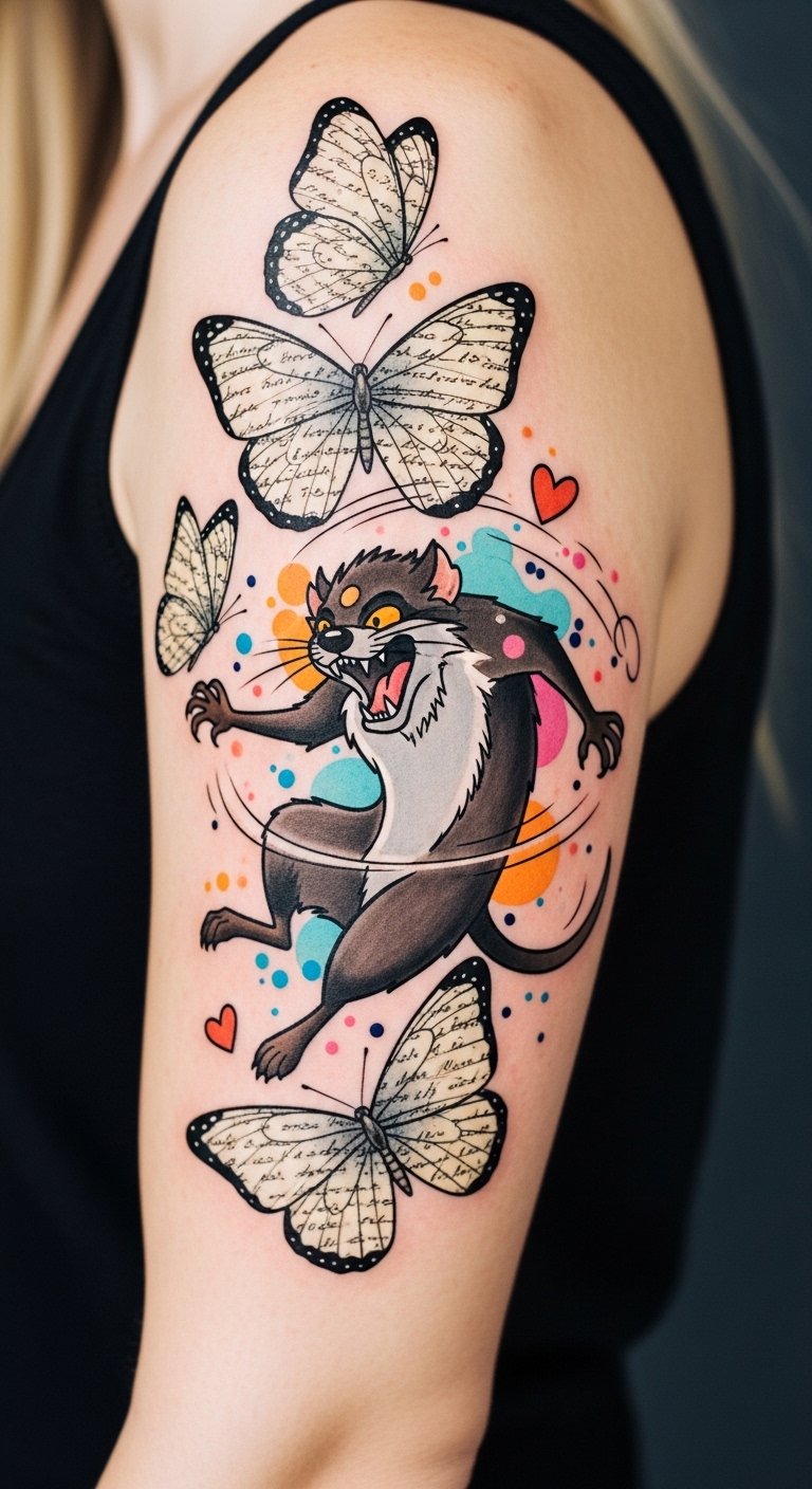 This design uses the Tasmanian Devil’s motion to symbolize inner turmoil and energy, while butterflies signify transformation and memory; theatrical elements hint at performance and humor, encouraging placement on the upper arm wrap or upper back to allow the composition room to breathe and interact with the wearer’s movement, evoking resilience and playful self-awareness.