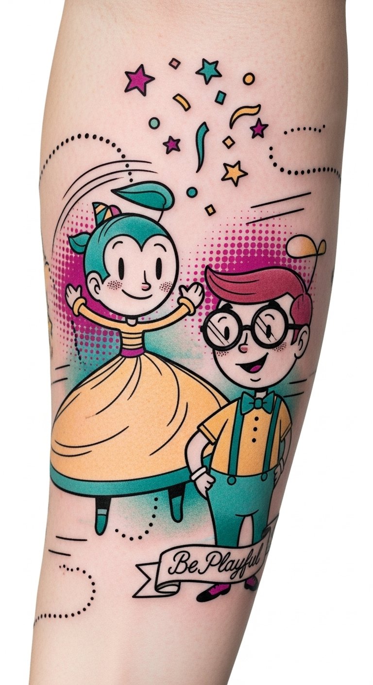 Emotionally upbeat and nostalgic, the piece balances bold cartoon lines with a gentle watercolor wash to keep it lighthearted. Ideal placement is the outer forearm or upper arm where the motion reads naturally; scale it to about 3–4 inches across so it feels personal yet visible, inviting interaction and conversation.