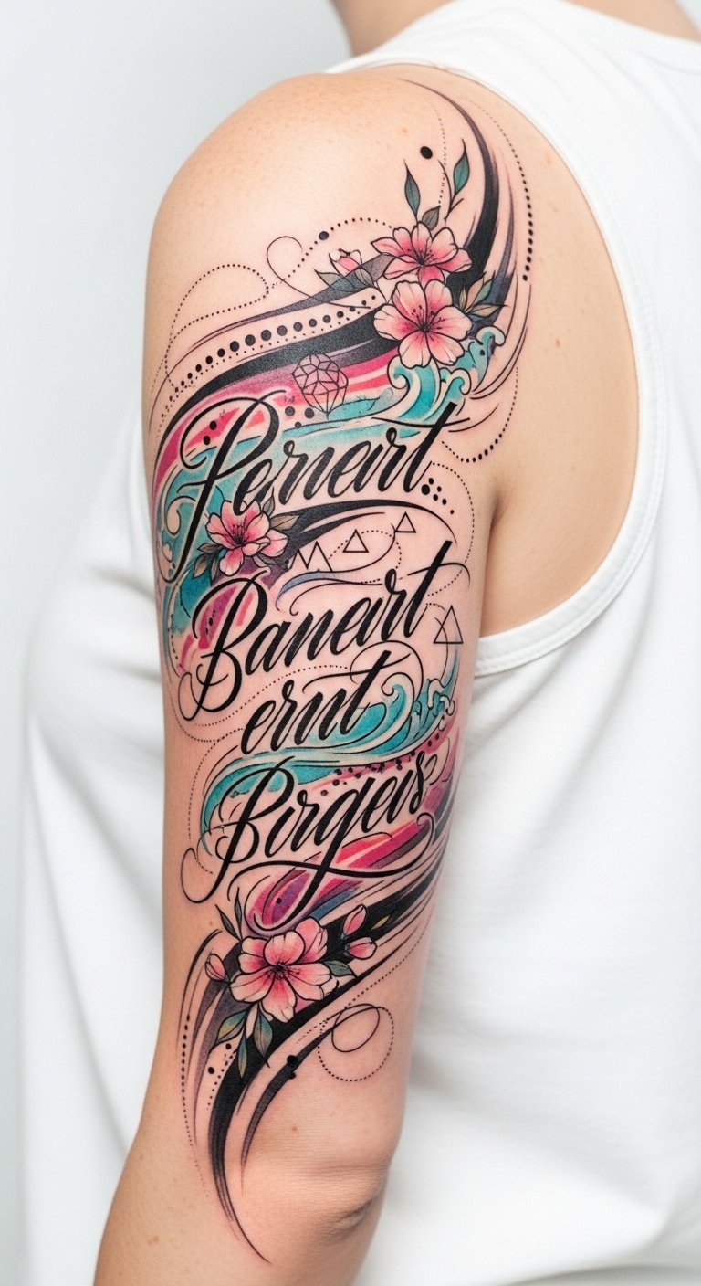 Body art becomes a bold declaration of who you are, inviting others to recognize and appreciate the art of self-expression in its many forms. This placement—forearm for visibility or shoulder blade for a more intimate reveal—uses the flowing composition to mirror emotional movement, the flowers and waveforms symbolizing growth and change, the geometric accents representing structure within identity; the watercolor palette evokes vibrancy and nuance, while fine line and dotwork add a personal, handcrafted feel.