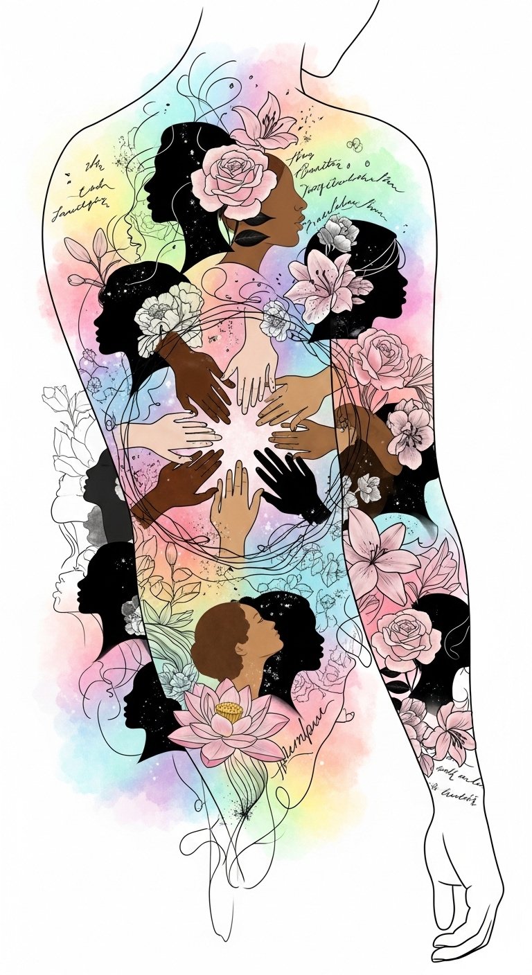 As a tattoo concept, this design symbolizes unity, acceptance, and personal narrative: the interwoven silhouettes and varied hands represent many identities coming together, while the blooming flowers signify growth and self-love.