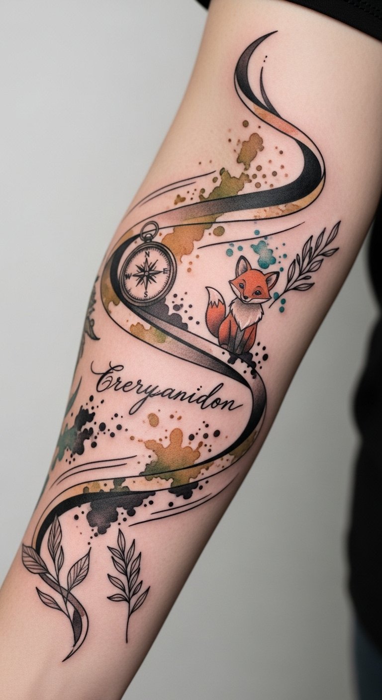 The ribbon represents the continuous thread of personal history, winding through scenes that symbolize direction (compass), playfulness and resilience (cartoon fox), and the distilled wisdom of a chosen phrase; watercolor splashes evoke emotion and freedom while fine-line botanicals ground the piece in growth and renewal.