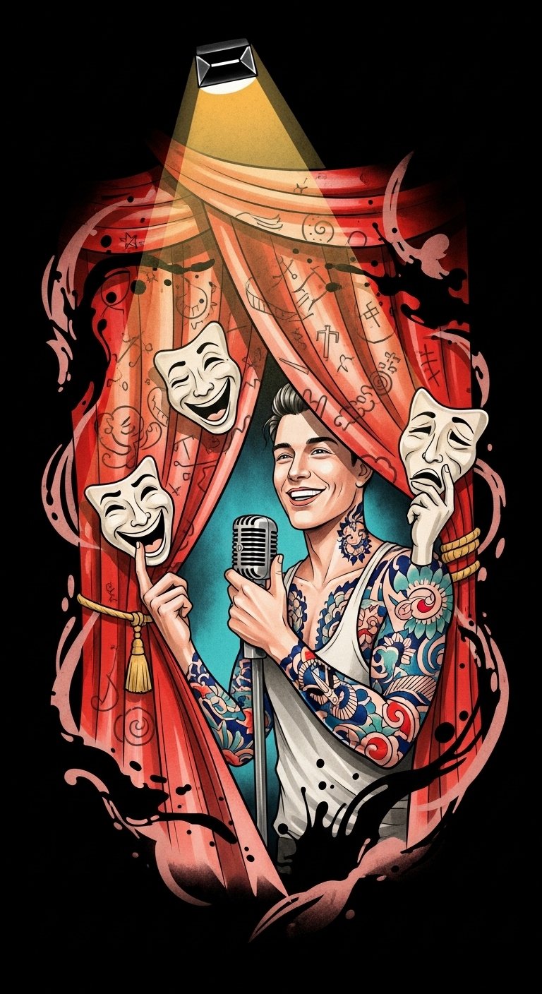 As body art continues to evolve in the domain of comedy, it’s fascinating to see how performers are using tattoos—real or imagined—as a vehicle for humor and storytelling. Through theatrical performance, they blend comedic expression with vibrant visuals, inviting audiences into their narratives. This playful integration of body art not only entertains but also sparks conversations about identity, culture, and personal experiences. The design symbolizes the fusion of performance and personal narrative: the parted curtain represents revelation, the performer embodies wit and vulnerability, and the imagined tattoos and cultural motifs celebrate identity and storytelling; placed on the upper arm or shoulder, the piece reads both onstage and off, evoking warmth, confidence, and playful introspection.