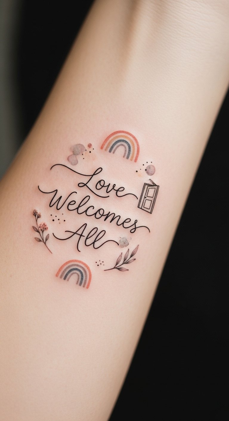 The design symbolizes Kristen’s shift from playful exaggeration to heartfelt expression. The phrase “Love Welcomes All” serves as a concise celebration of inclusivity inspired by her children.