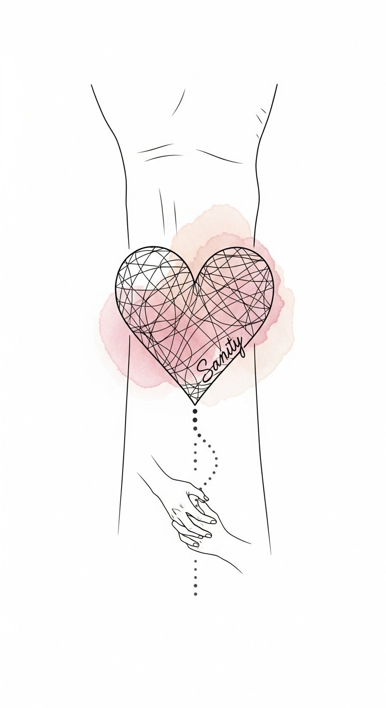 This design emphasizes balance and fragility: the handwritten script conveys personal ownership, the broken circle suggests protection that’s imperfect yet intentional, the pastel smudges evoke the emotional turbulence beneath a calm exterior, and the faint heartbeat line anchors the piece in resilience and life.