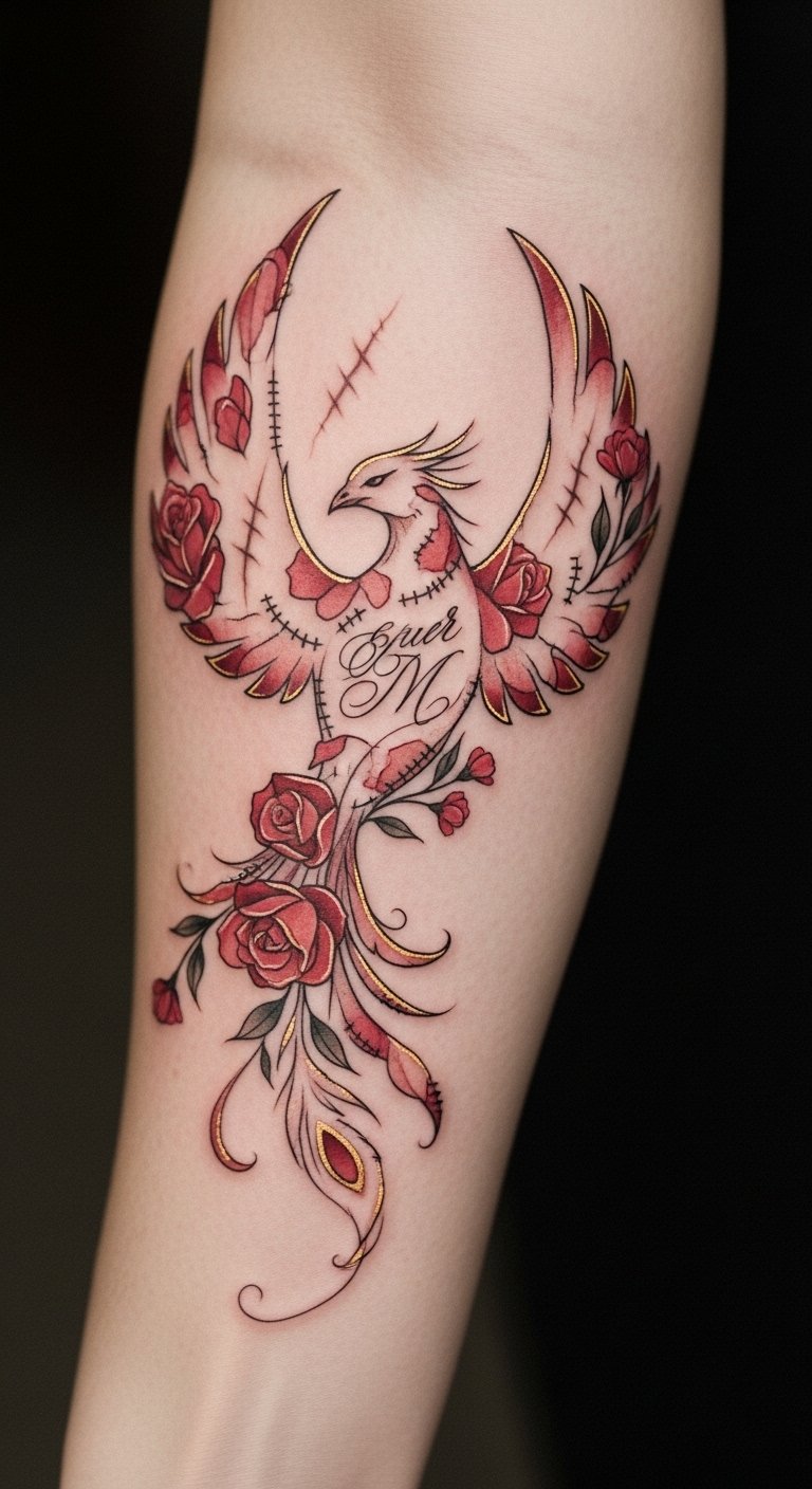 A design that blends a phoenix formed from torn rose petals and visible stitched seams symbolizes rebirth from emotional rupture; the fading original initials into a new script represents letting go while honoring the past, and the vines growing from scars depict healing and continued growth. Place on the inner forearm for daily visibility and personal affirmation, the collarbone for intimate elegance near the heart, or the ribcage for a private, protective space—each placement adds nuance to the emotional narrative and allows the wearer to carry transformation as wearable art.