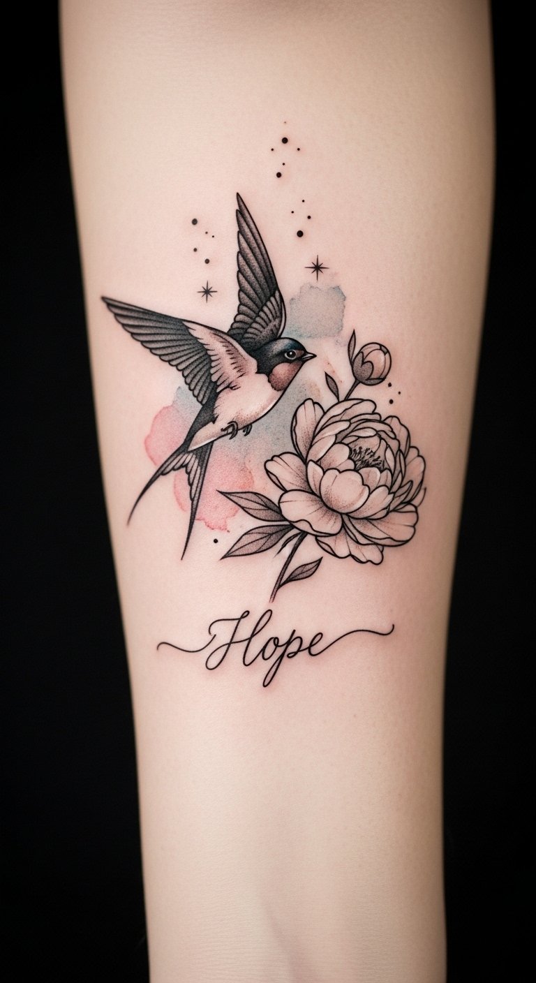The swallow symbolizes protection and safe return, the peony embodies beauty and maternal nurturing, and the soft watercolor blush adds warmth and tenderness; placed on the inner forearm, the piece stays intimate and visible to the wearer, evoking gentle pride and constant closeness whenever glanced at.