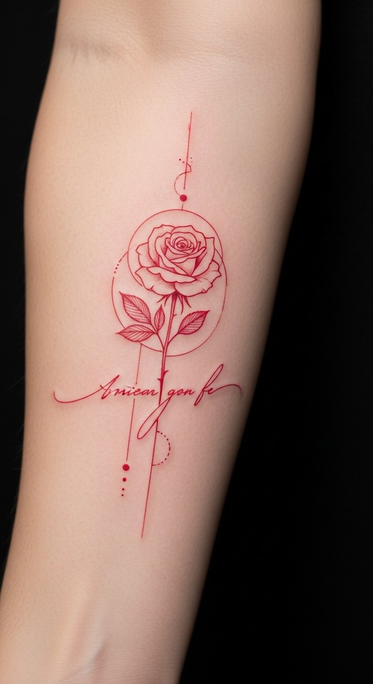 The design uses the red rose as a focal symbol of passion and individuality, the flowing script suggesting personal narrative and freedom of expression, and the geometric accents grounding the composition with balance and clarity.