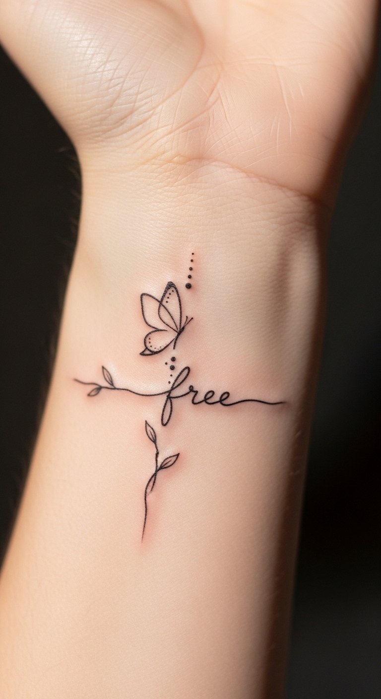 Kylie’s approach invites you to explore freedom through elegant, meaningful body art. The design symbolizes transformation and liberation—the butterfly for growth, the script for personal affirmation, and the vine as connection and resilience—evoking quiet confidence; ideal placement is the inner wrist where the piece reads intimately to the wearer and peeks subtly to others, creating a gentle emotional anchor.