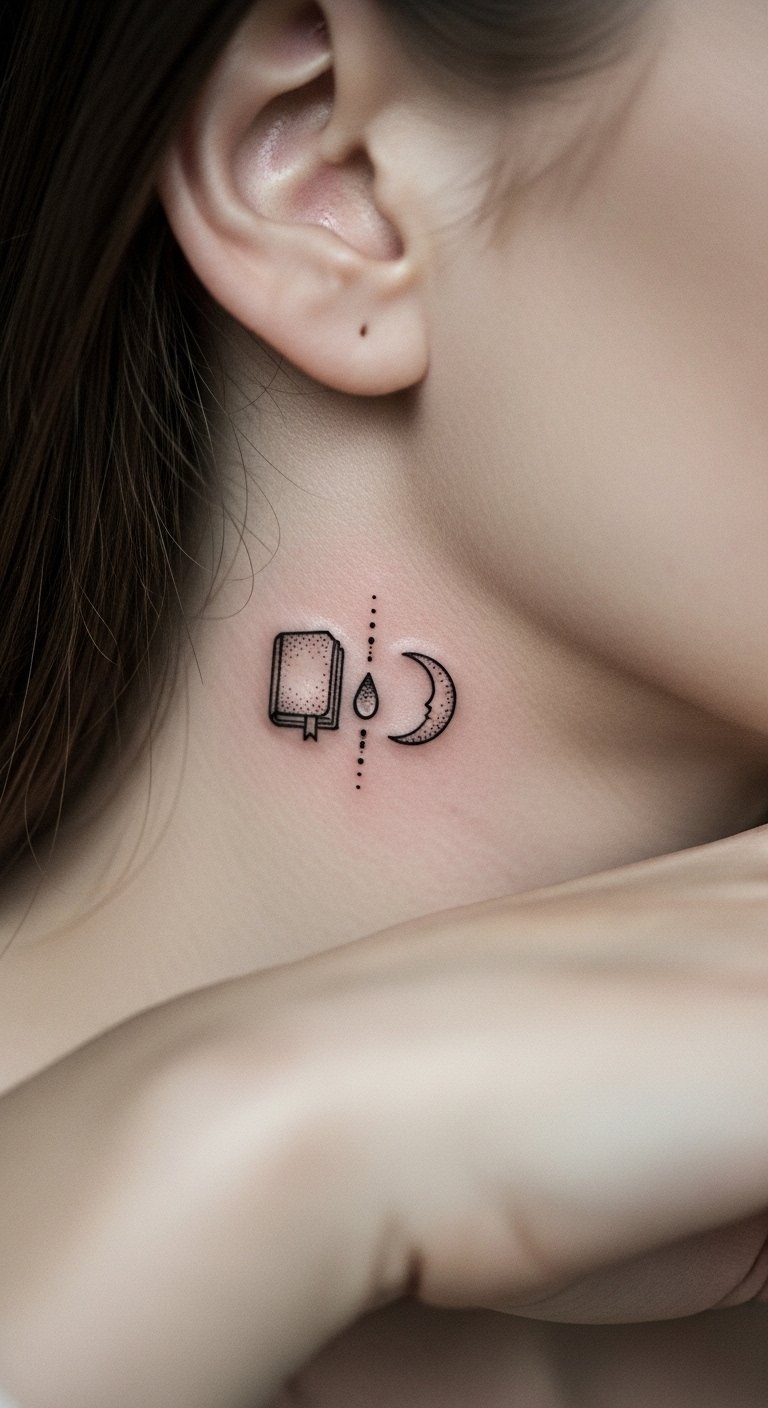 This design concept reflects the original idea of hidden tattoos as intimate expressions: the closed book represents personal stories kept private, the teardrop acknowledges deep emotions tied to those memories, and the crescent moon signifies quiet personal growth and cycles.
