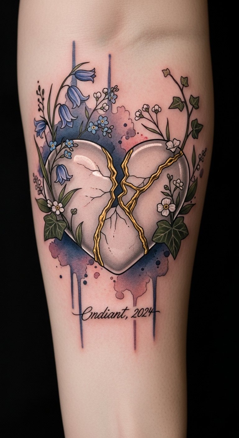 Watercolor accents add emotional warmth and a sense of movement. Recommended placement is the forearm for daily visibility and intimate storytelling, or the back shoulder for a larger, contemplative canvas that flows with the body’s contours.