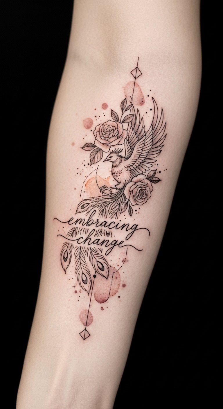 The design symbolizes rebirth (phoenix) and beauty found through struggle (roses), the handwriting script personalizes the message of acceptance, watercolor tones evoke vulnerability and warmth, and the inner forearm placement makes it both intimate and visible—a daily affirmation of resilience and ongoing transformation.