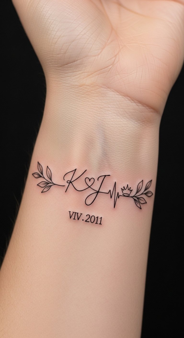 From initials to meaningful dates, these tattoos serve as a constant reminder of the love and support that fuels her spirit, allowing her to express her family ties boldly and beautifully. The design combines initials, a heartbeat, a crown, and a Roman numeral date to symbolize identity, enduring love, personal strength, and a specific cherished moment; placed on the inner wrist for intimacy and visibility, the fine-line style evokes tenderness and permanence while the small leaves add growth and continuity, inviting quiet emotion and daily remembrance.