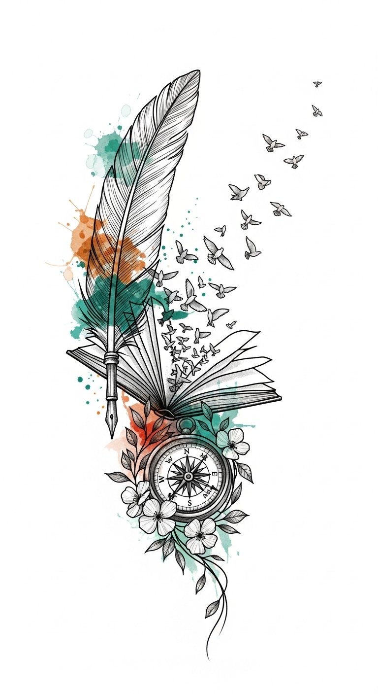 Tattoos often serve as a canvas for personal stories, allowing individuals to express their unique identities and experiences. In this design, the quill and book represent narrative and memory, the pages becoming birds symbolize transformation and liberation, the compass denotes guidance through personal values, and the flowering vines show growth and flourishing.
