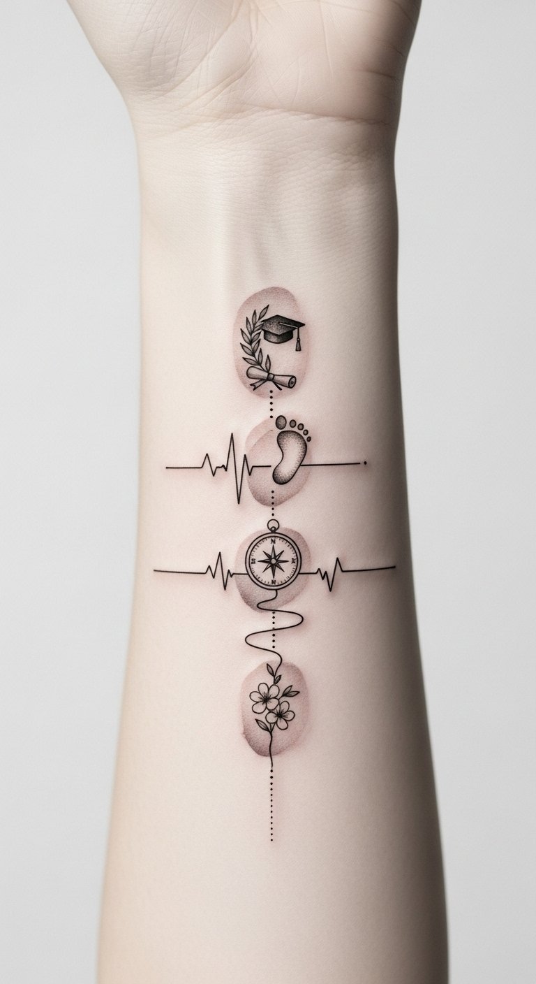 This placement on the inner forearm (or along the wrist for a smaller version) keeps the imagery intimate yet visible; the connecting line represents continuity and personal evolution, the icons evoke specific memories and emotions, and the muted wash adds warmth without overpowering the fine-line detail.