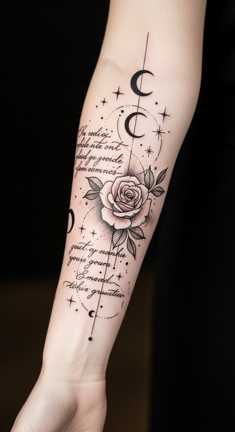 Ideal placement is a half-sleeve flowing from shoulder to inner forearm so the elements can interweave and be revealed in movement, allowing intimate details like the fine-line script and crescent accents to sit where she can see them easily.