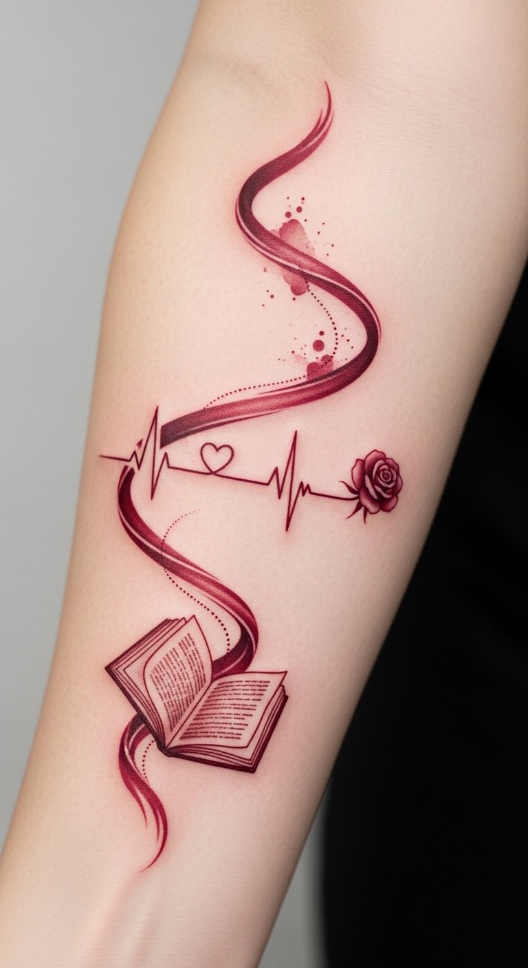 The crimson ribbon-book and heartbeat-to-rose design symbolizes passion, courage, and love woven into a personal narrative.