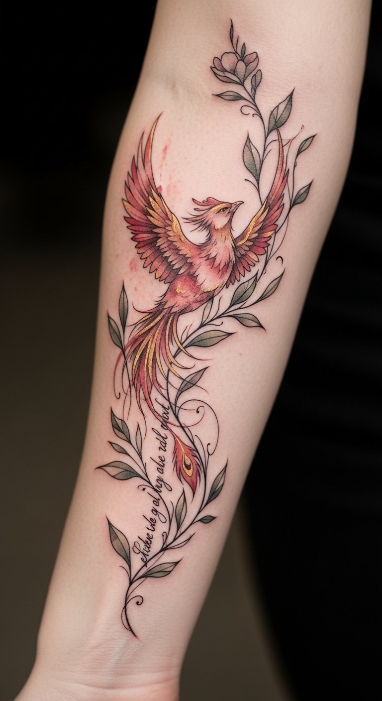 This forearm placement emphasizes visibility and intimacy—resilience shown by the phoenix, growth and grounding by the vines, and the woven script as a quiet, continuous reminder; the watercolor palette evokes emotional warmth while fine-line detail keeps it elegant and personal.