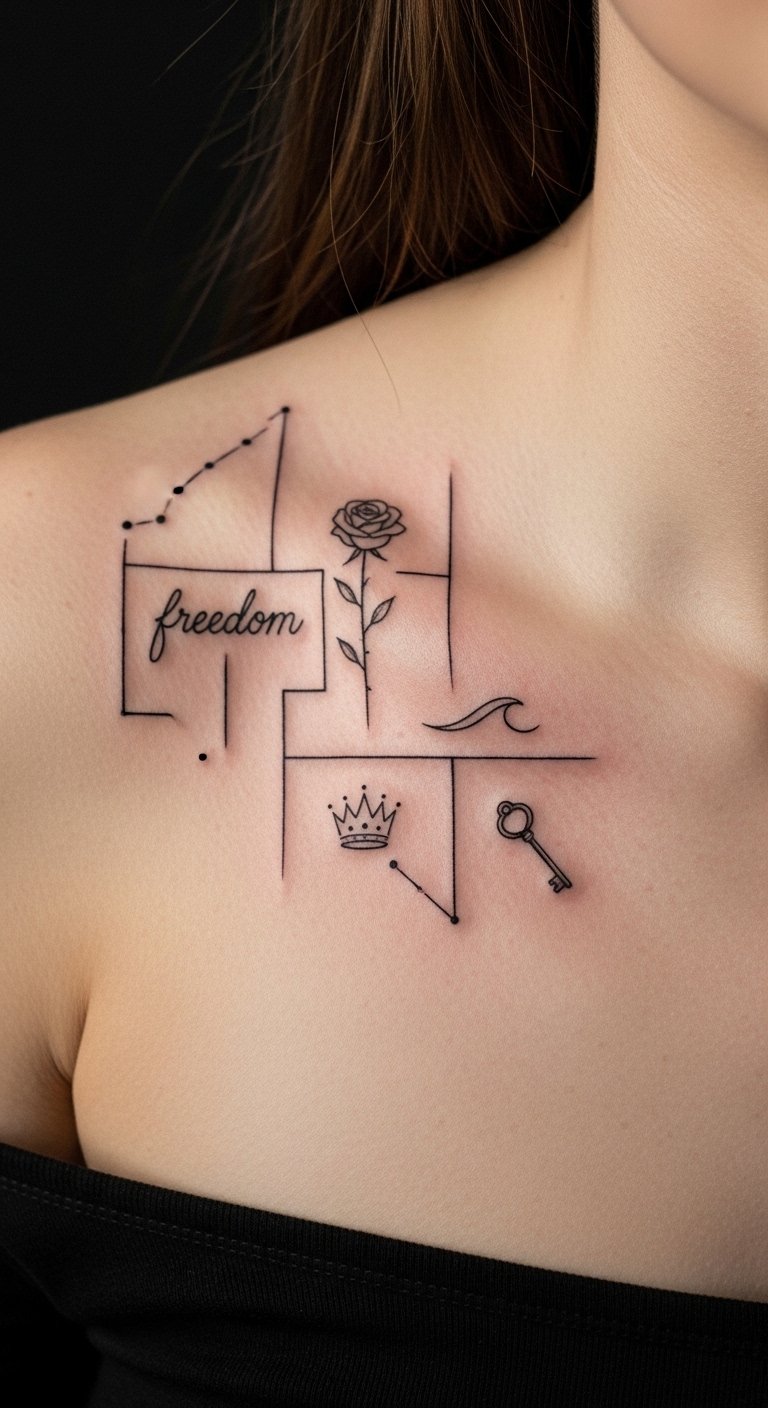 Through these tattoos, Kylie embraces freedom of expression, inspiring others to do the same. The proposed cluster blends symbols of empowerment (crown), romance and growth (rose), emotional depth (wave), personal access and secrets (key), and the word “freedom” to evoke liberation; placed along the shoulder and collarbone, the composition reads as intimate yet visible, creating an emotional interplay of vulnerability and strength while complementing natural body lines for both subtlety and statement.