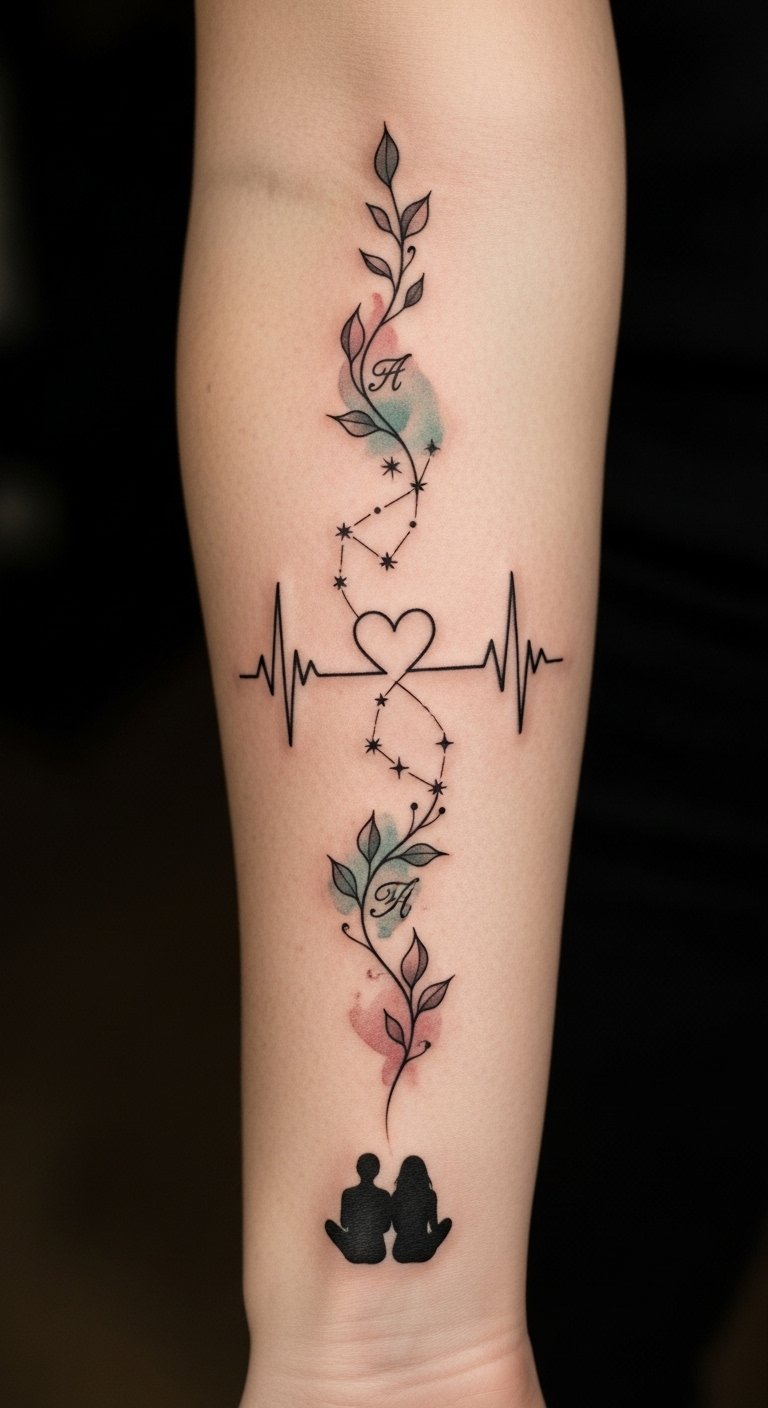 The vine represents continual growth and connection; the heartbeat line signals emotional highs shared with loved ones; linked constellations symbolize lasting friendships and moments that guide her; the two seated silhouettes embody companionship and quiet intimacy.