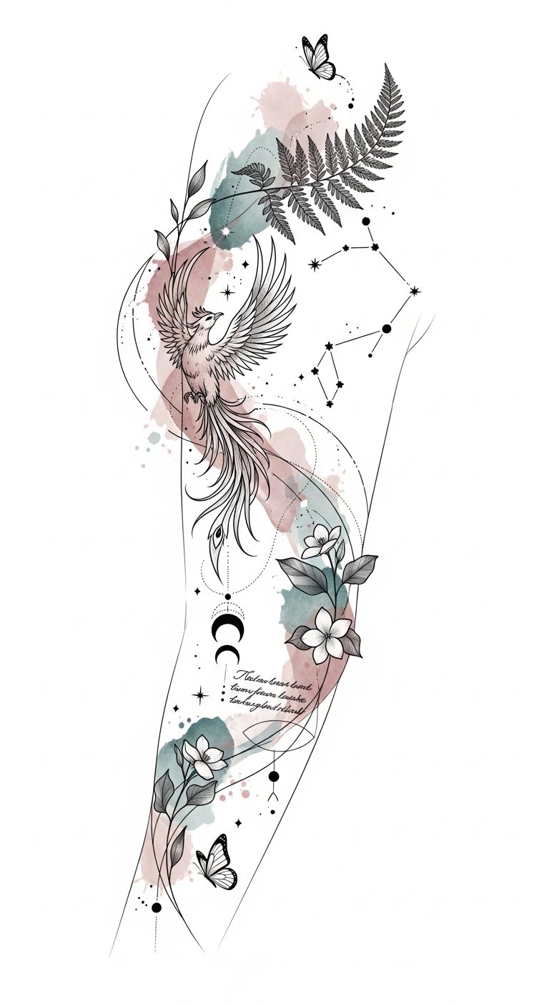 Keep an eye out for enchanting new ink that speaks to her ever-changing story. The design merges a phoenix for rebirth, constellations for guidance, and night-blooming jasmine for quiet resilience, while watercolor hues express emotional transitions; delicate ferns and a butterfly silhouette symbolize personal transformation and continuity.