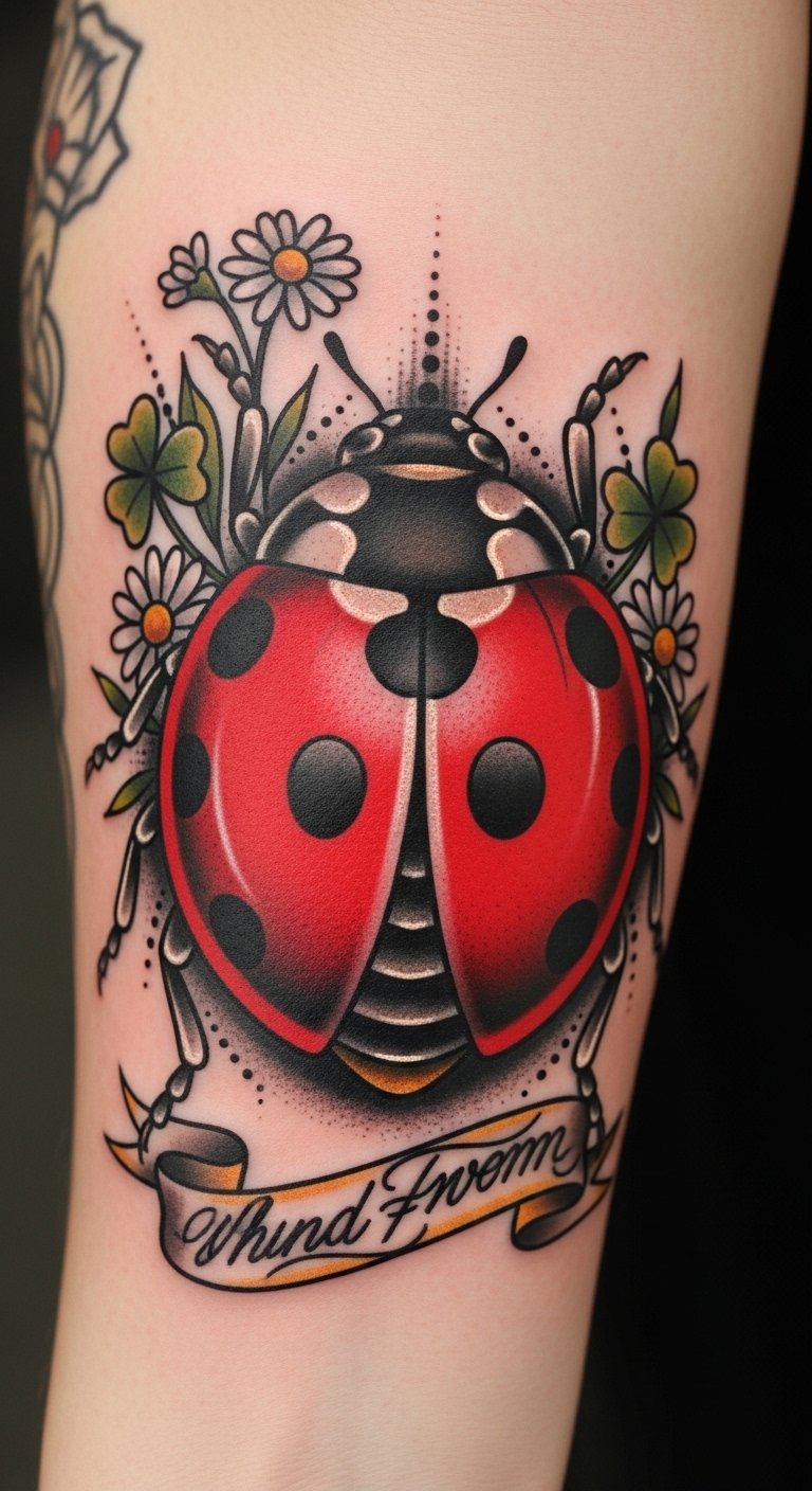 These vintage ladybug aesthetics can transform your tattoo into a unique statement, celebrating freedom and joy. Embrace the whimsy and let your ink tell a story that’s both enchanting and memorable. This design symbolizes protection, luck, and joyful resilience; it evokes lighthearted nostalgia and quiet confidence.