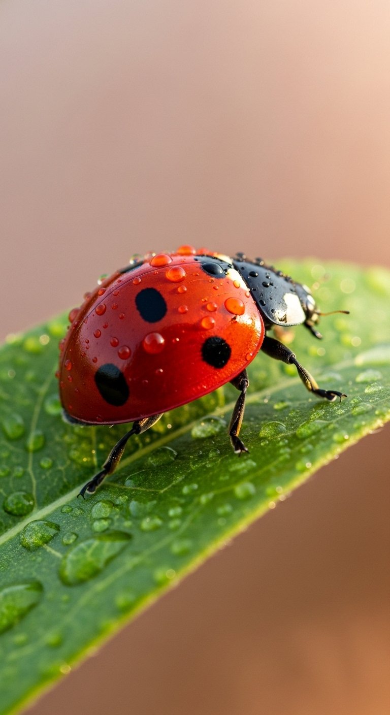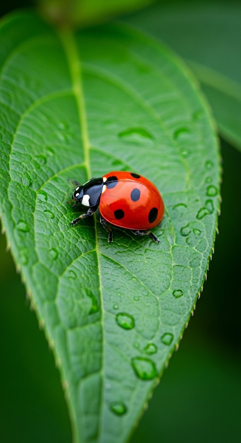 This design emphasizes symbolism of luck, protection, and simple joys; the vivid contrast between the ladybug and leaf evokes warmth and optimism while the intimate scale invites personal reflection.