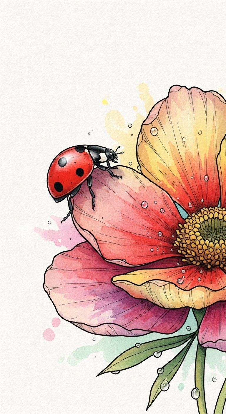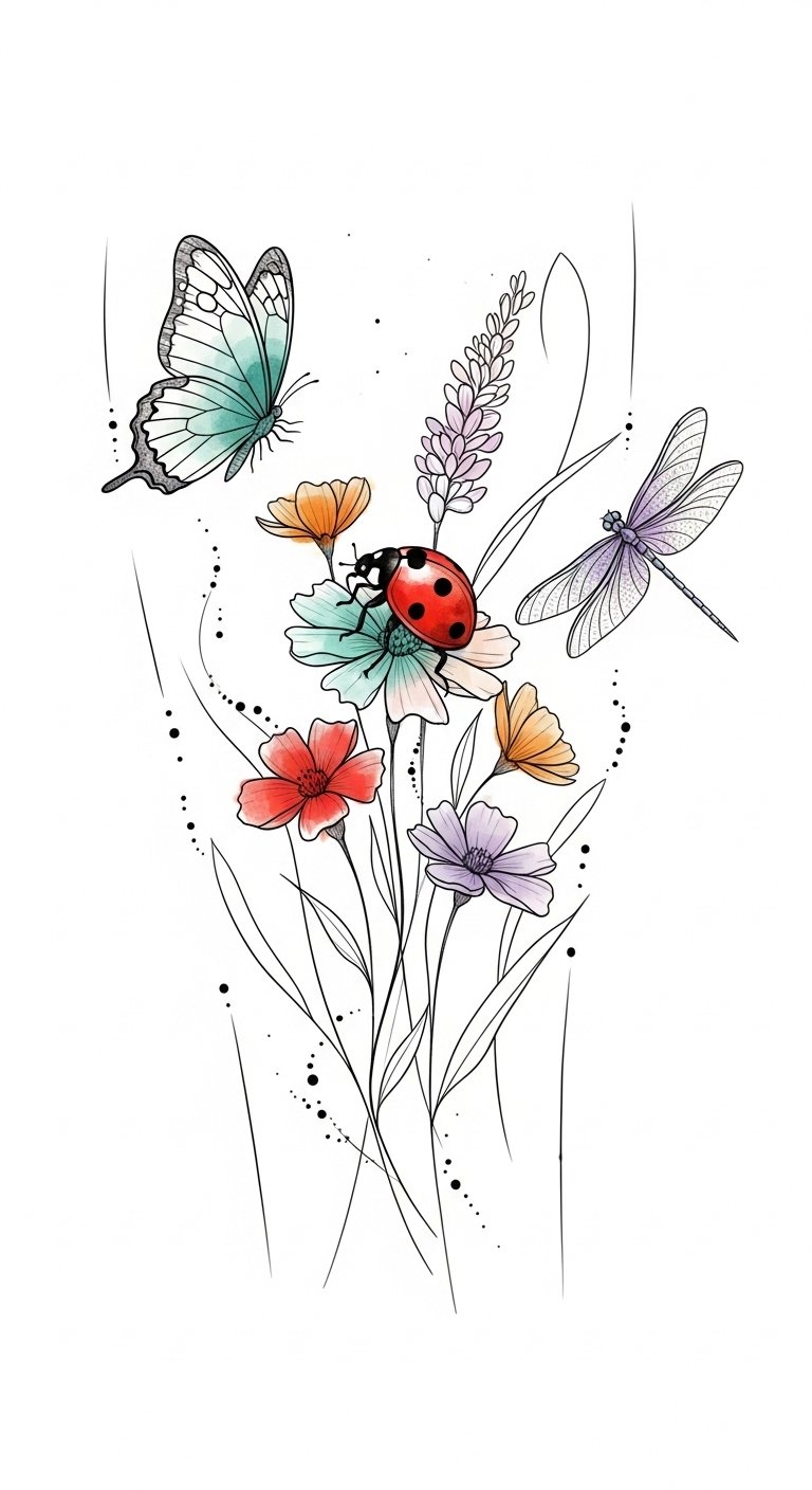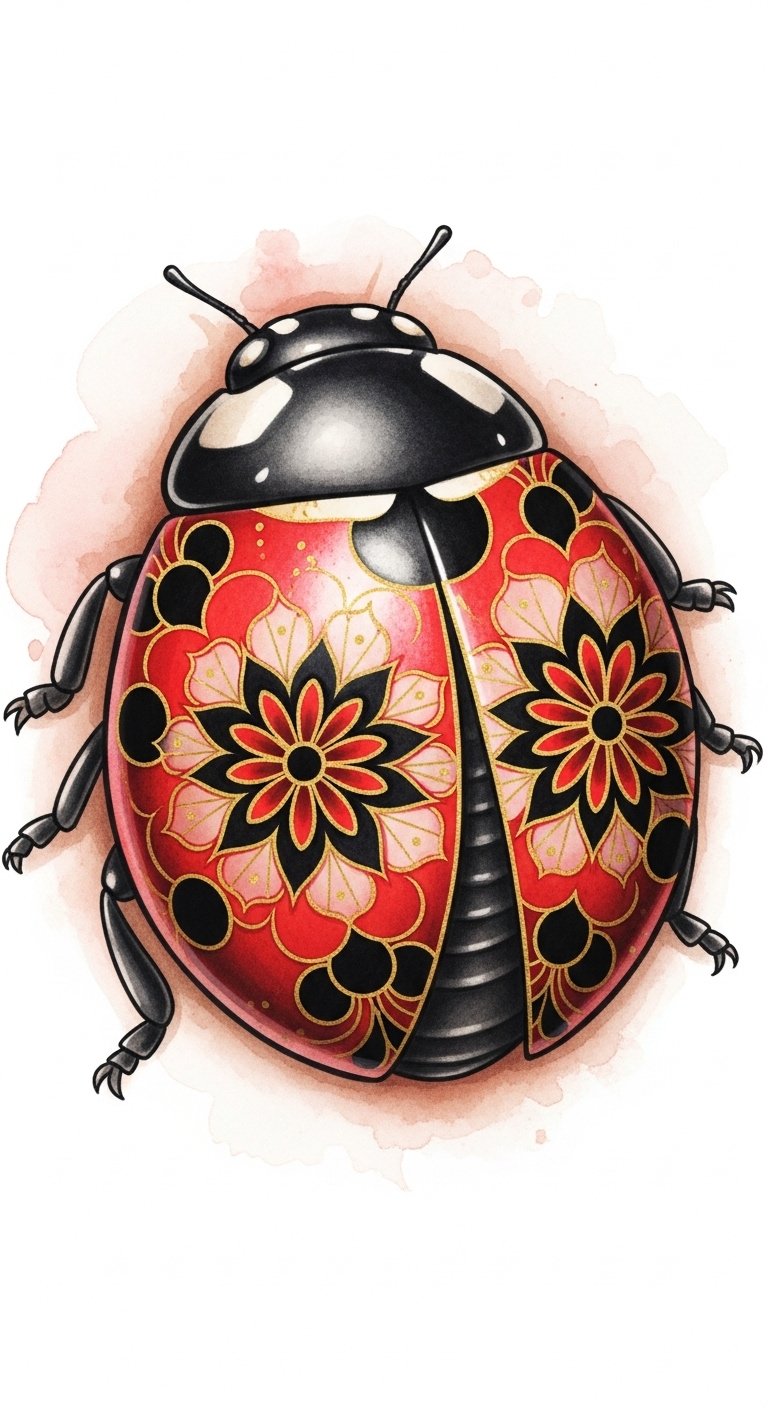This design emphasizes luck and protection through the ladybugs, transformation and freedom through flowing vines and watercolor washes, and balance through subtle mandala geometry; emotionally it evokes warmth, optimism, and gentle resilience.