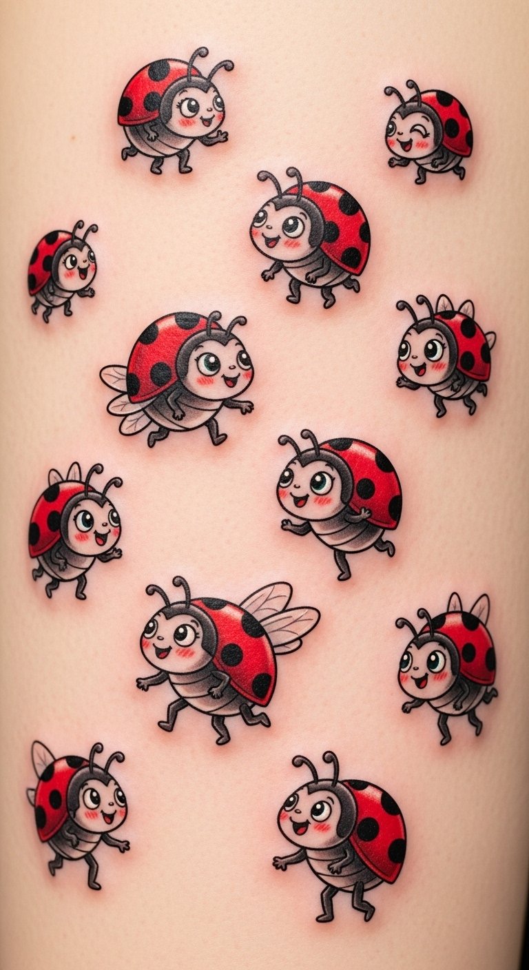 This design concept centers on bright, cheerful ladybugs in a lively, animated style to evoke nostalgia and carefree joy; the imagery symbolizes good luck, curiosity, and the small adventures woven into everyday life. Emotionally it aims to uplift and encourage playfulness, suitable for people who want a reminder to find wonder in little things. Ideal placements include the wrist, ankle, shoulder blade, or behind the ear for small designs, while a flowing forearm or calf piece works well for a series of dancing ladybugs.