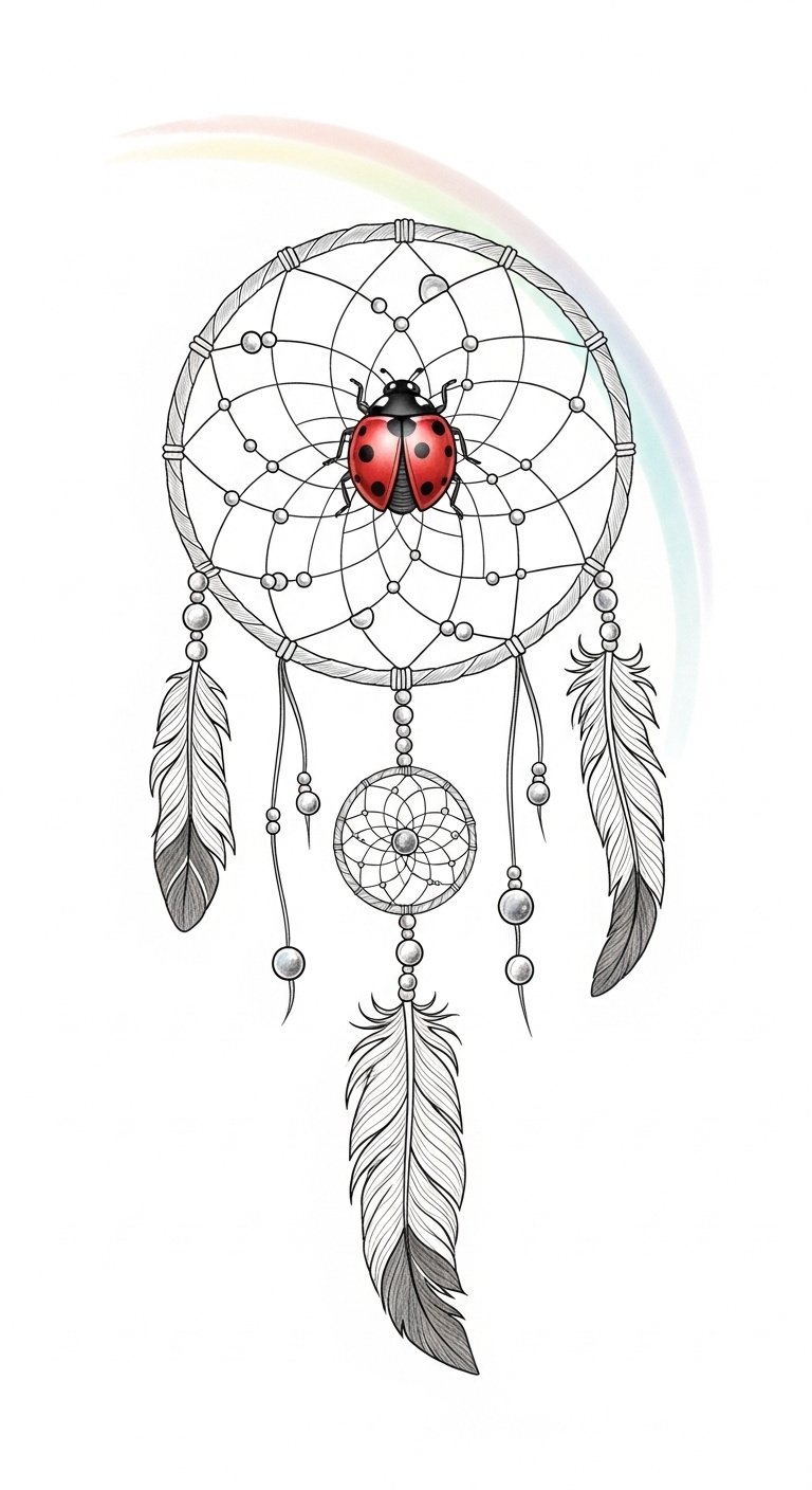 This design beautifully merges ladybug symbolism—representing luck and joy—with dreamcatcher meanings that guard against negativity. Together, they create a mesmerizing tattoo, embracing freedom, protection, and positivity, reminding you to catch your dreams while inviting abundance into your life.